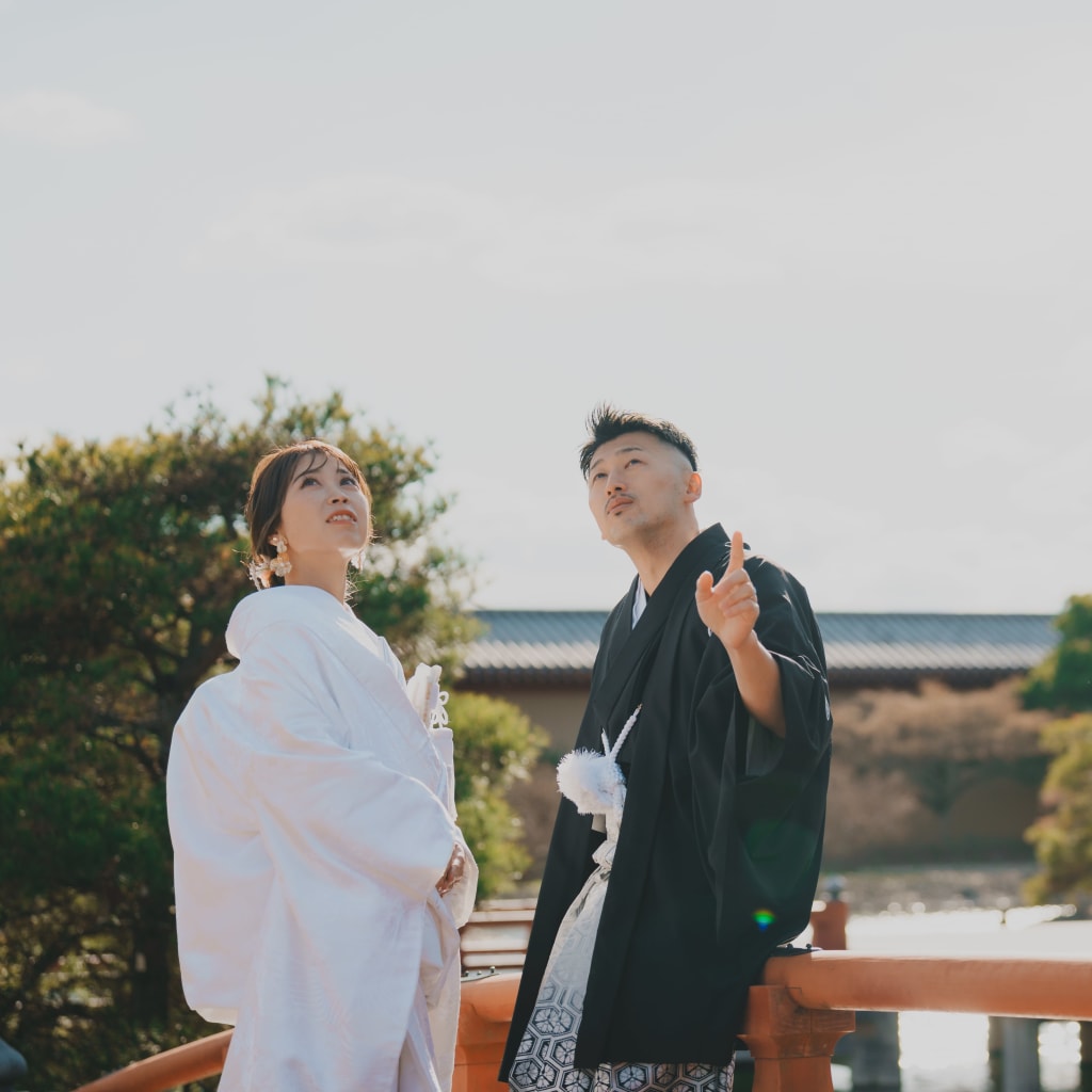 歴史的価値の高い日本庭園で、格式高い結婚写真に