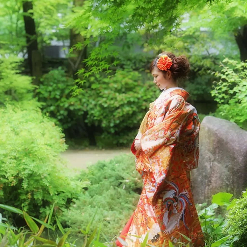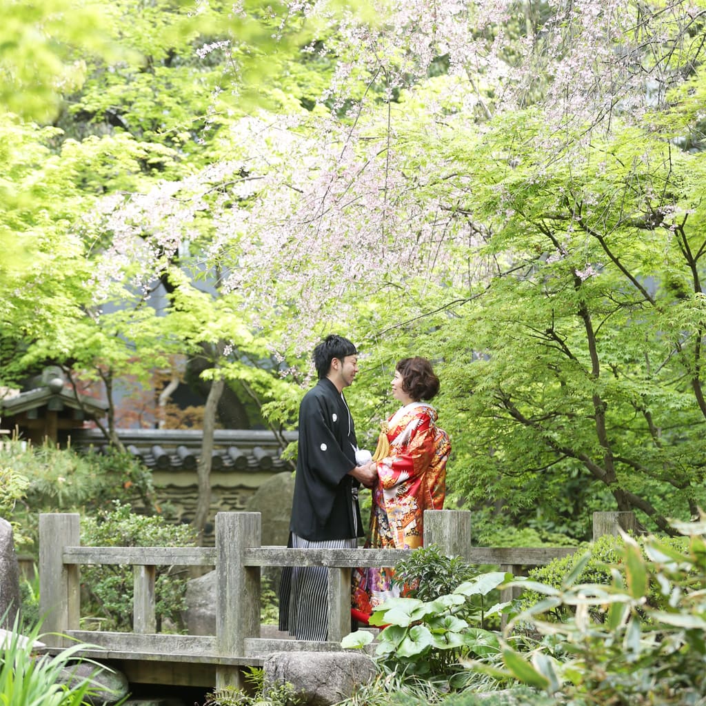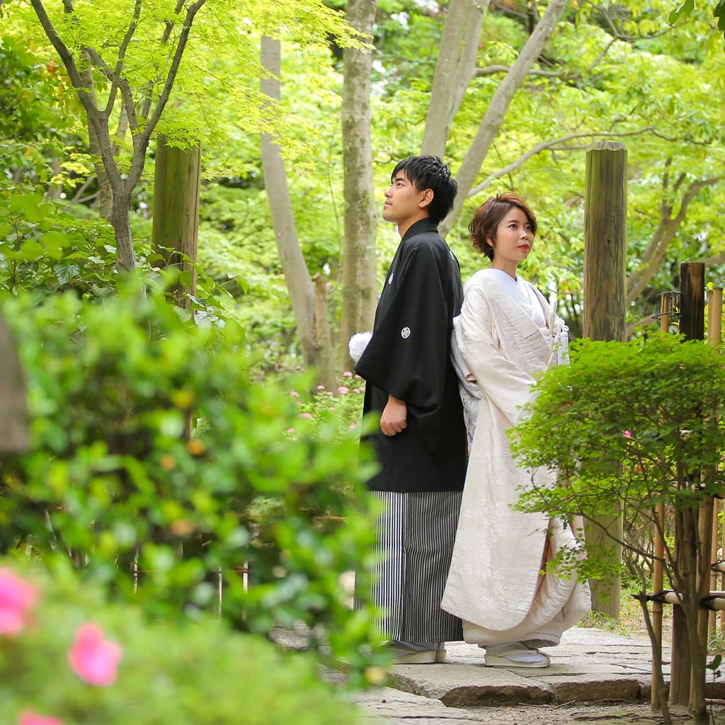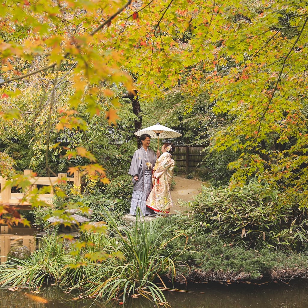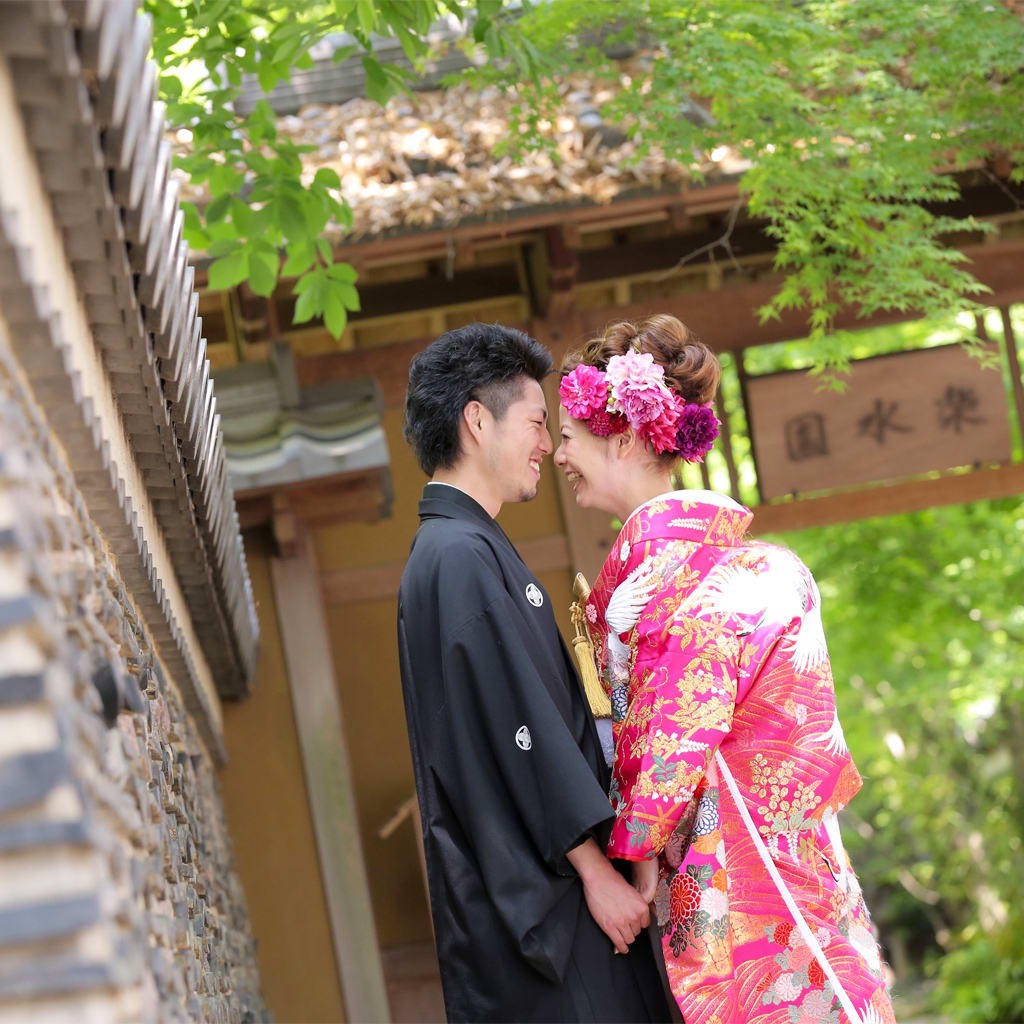 楽水園は博多駅近くの歴史ある日本庭園。オフィス街にありながら、ひとたび足を踏み入れると落ち着いた和庭園が心を癒やします。美しく整えられた庭園には清らかな渓流が流れ、風情漂う季節の花々が咲き、和装の結婚写真に華を添えます。
