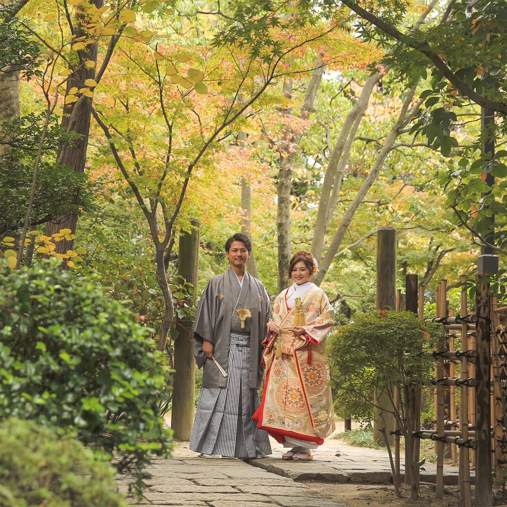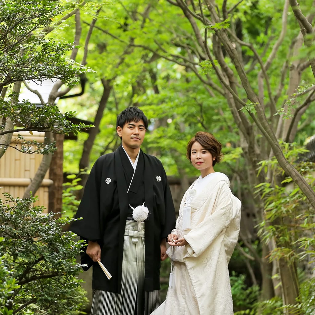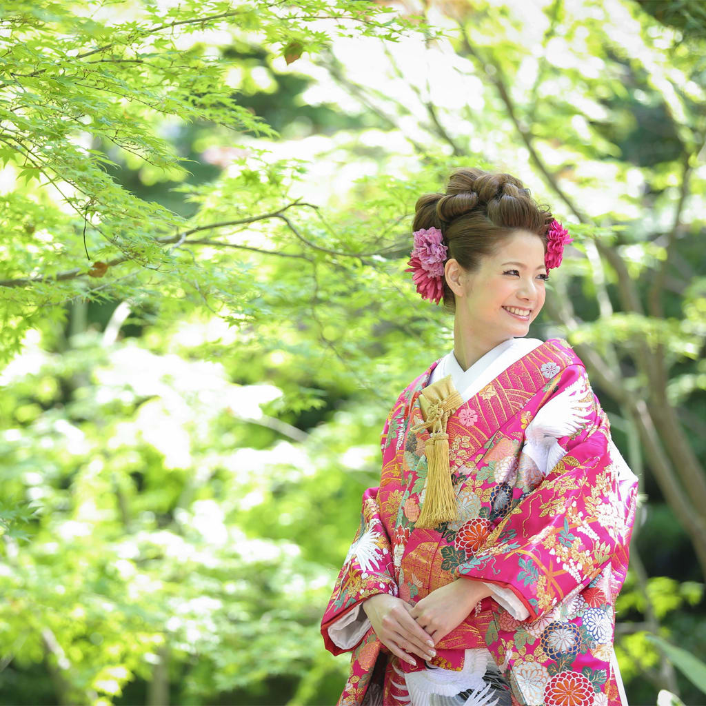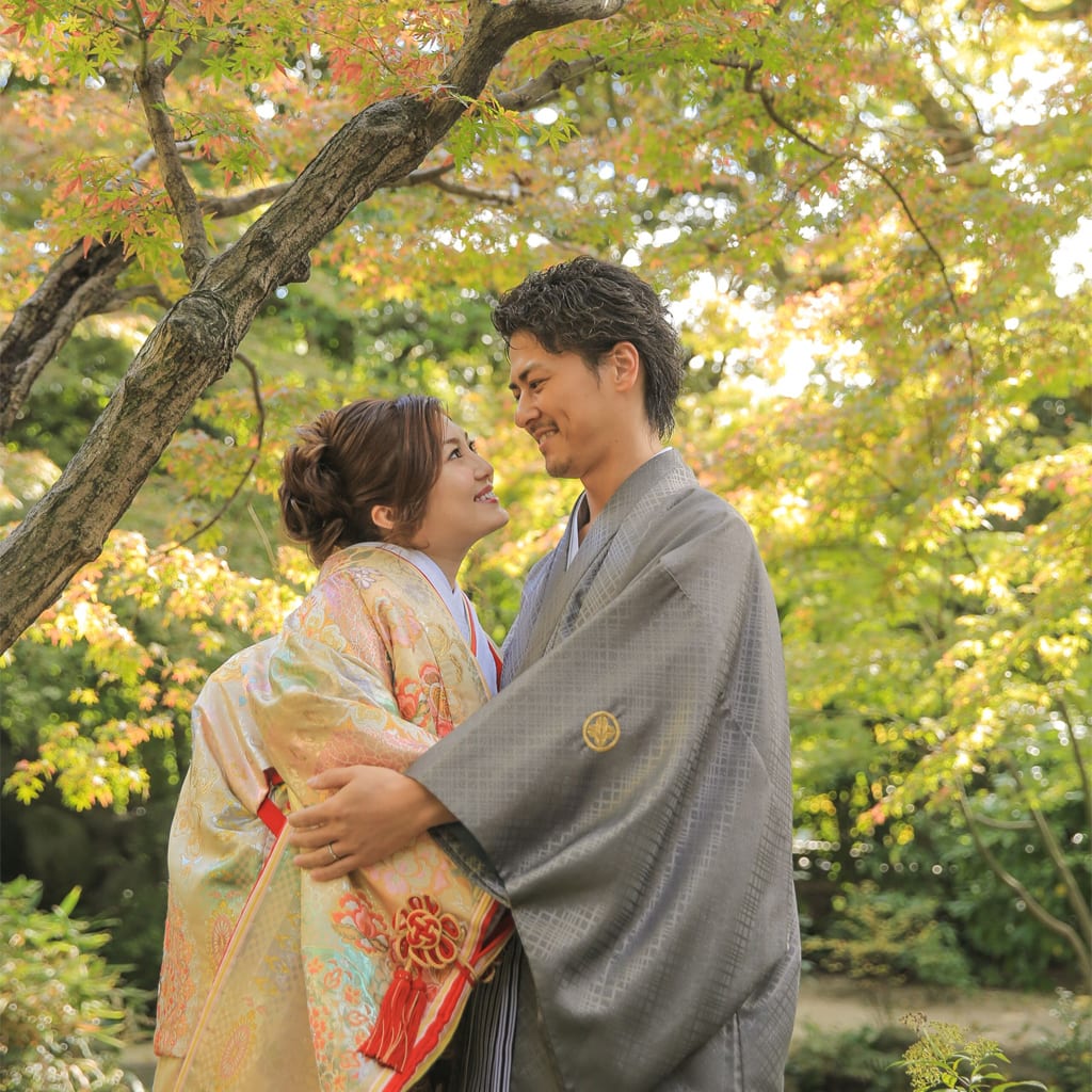 楽水園は博多駅近くの歴史ある日本庭園。オフィス街にありながら、ひとたび足を踏み入れると落ち着いた和庭園が心を癒やします。美しく整えられた庭園には清らかな渓流が流れ、風情漂う季節の花々が咲き、和装の結婚写真に華を添えます。