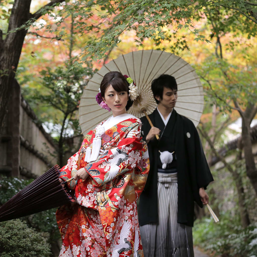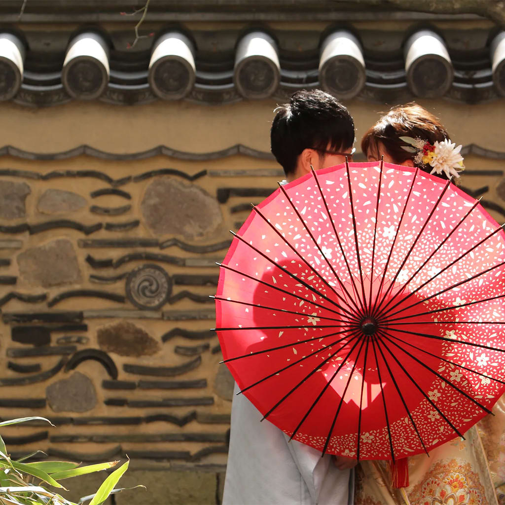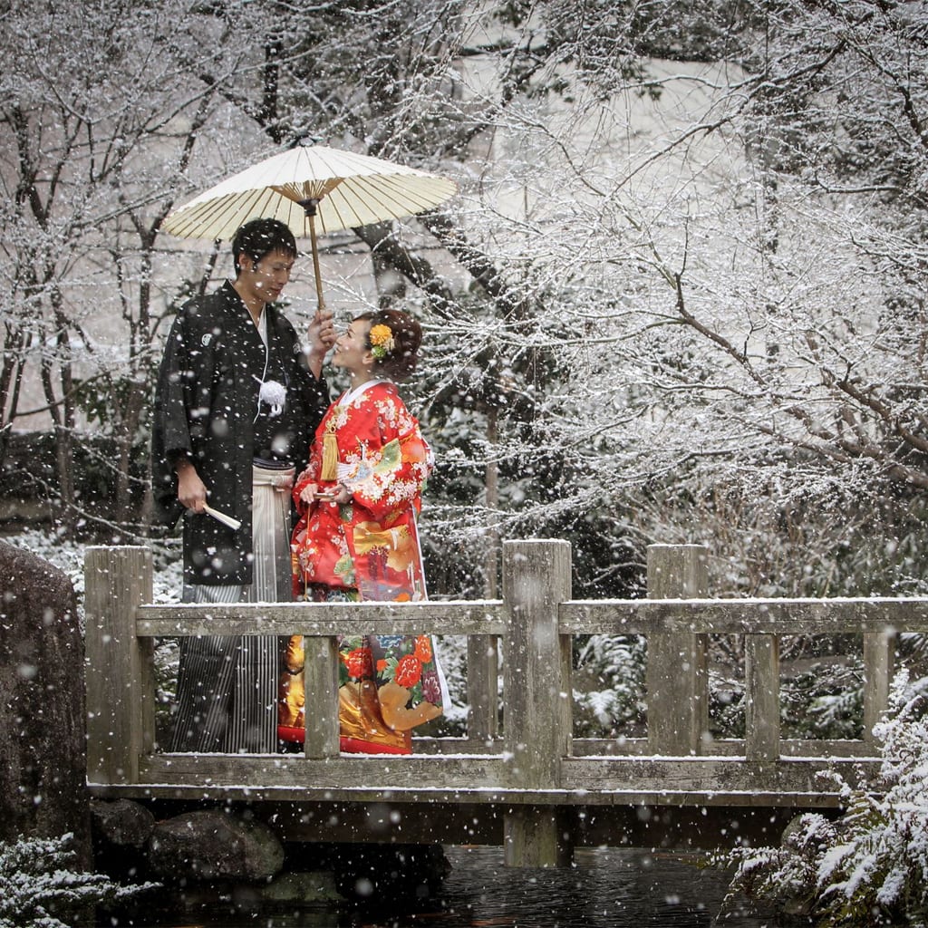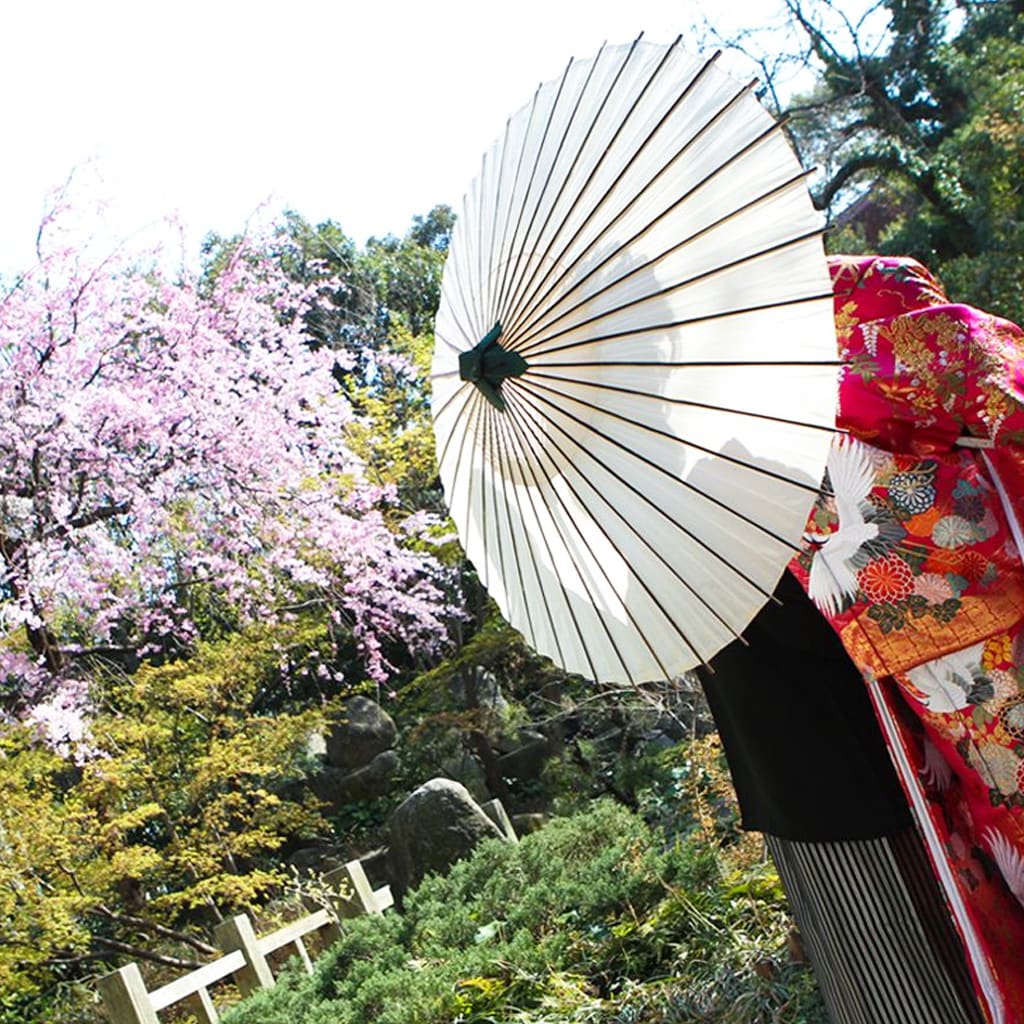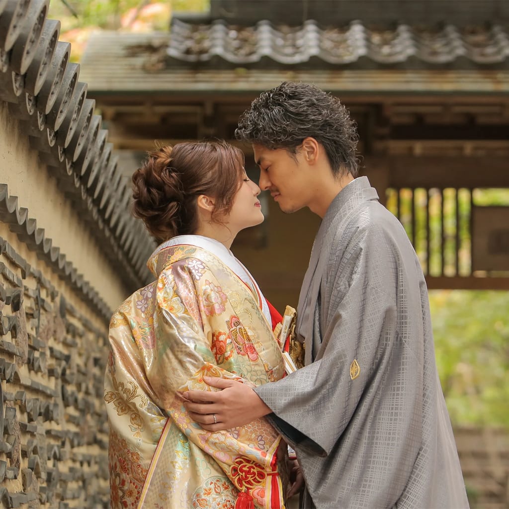 楽水園は博多駅近くの歴史ある日本庭園。オフィス街にありながら、ひとたび足を踏み入れると落ち着いた和庭園が心を癒やします。美しく整えられた庭園には清らかな渓流が流れ、風情漂う季節の花々が咲き、和装の結婚写真に華を添えます。