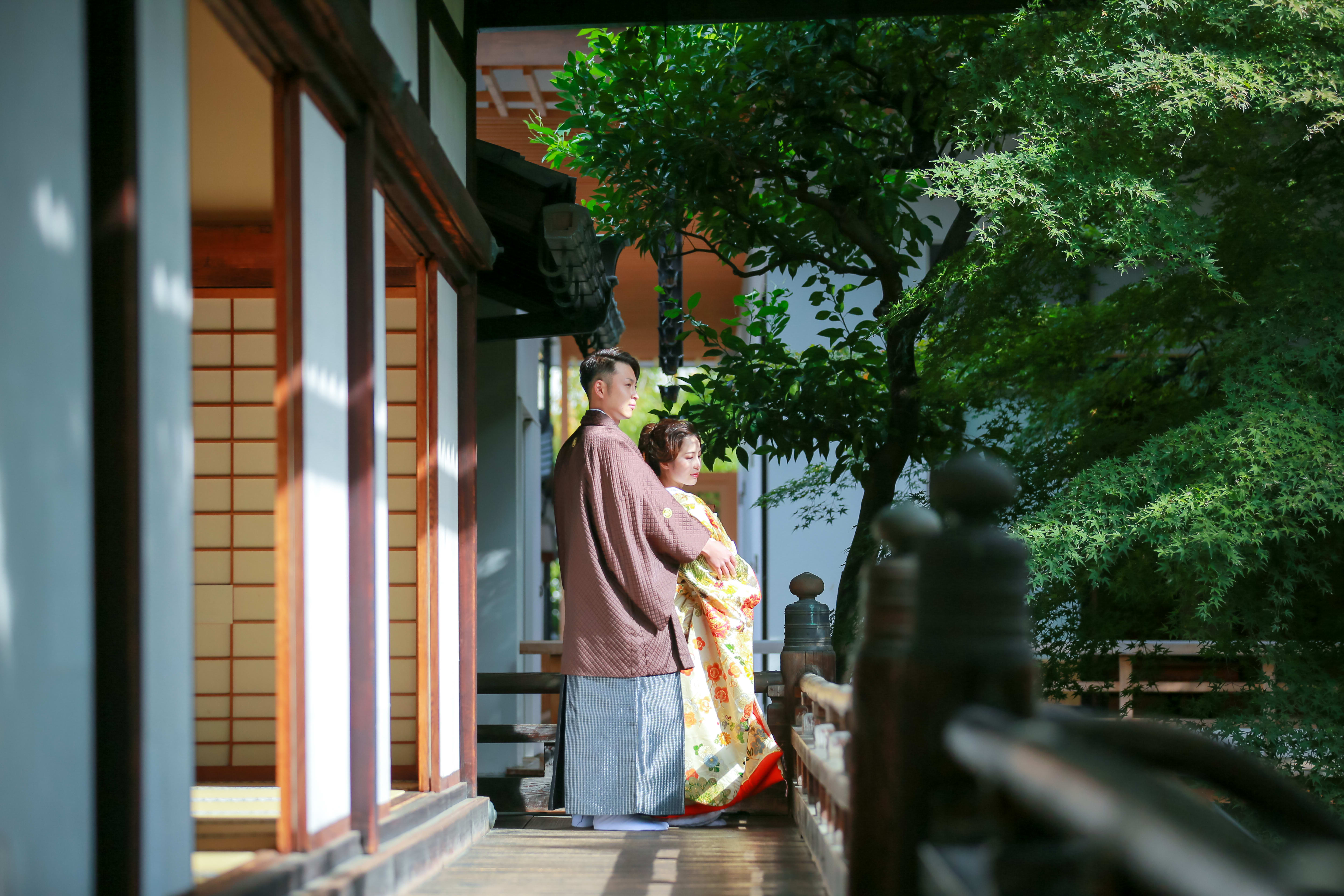 美しい中庭は初夏の新緑も秋の紅葉もお楽しみいただけ、お堂を結ぶ橋での撮影はとても『絵』になります。境内には京都市内でも有名な枝垂れ桜もあり、春の前撮り・フォトウェディングでも人気です。一般の観光客の方々には非公開の書院でも撮影することが出来ます。