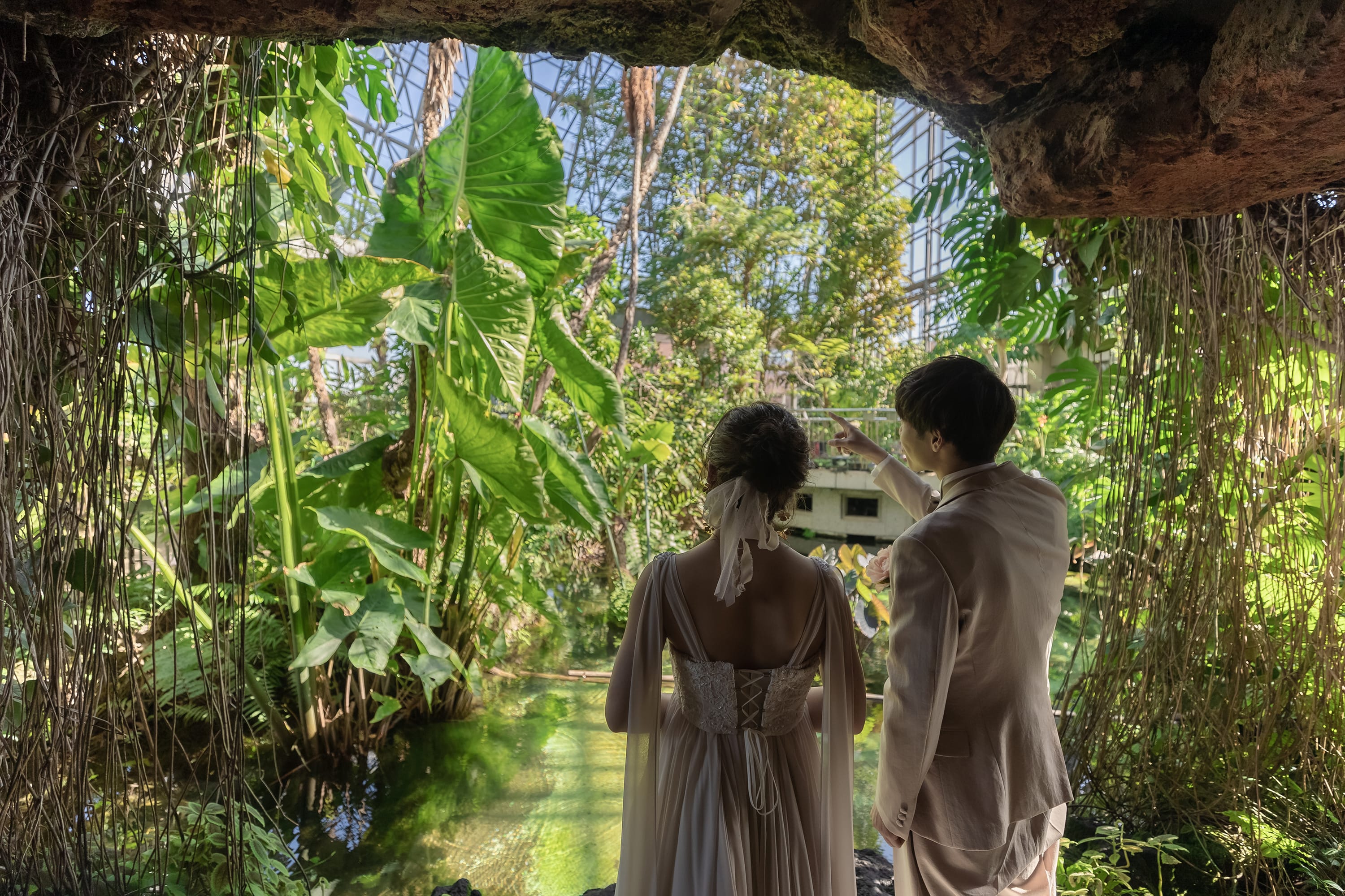 ガラスドームの中は珍しい熱帯植物に囲まれ、まるでジャングルのよう