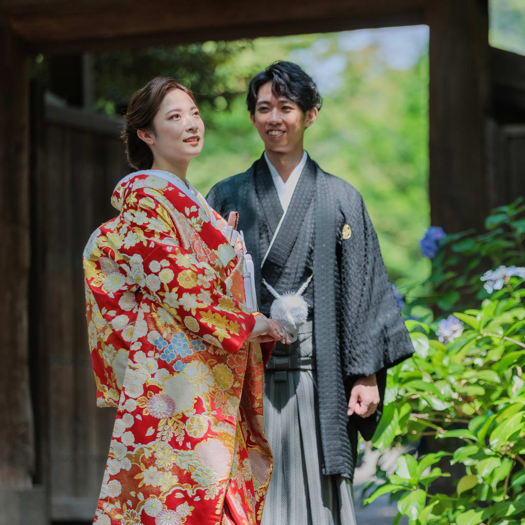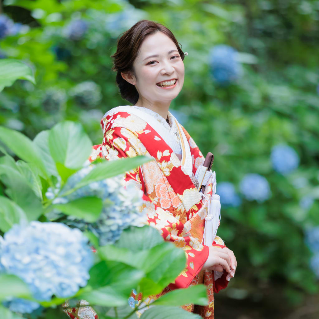 緑豊かで広い池をもつ明るい庭園でのロケーション撮影は、優美な和装姿を引き立てます。