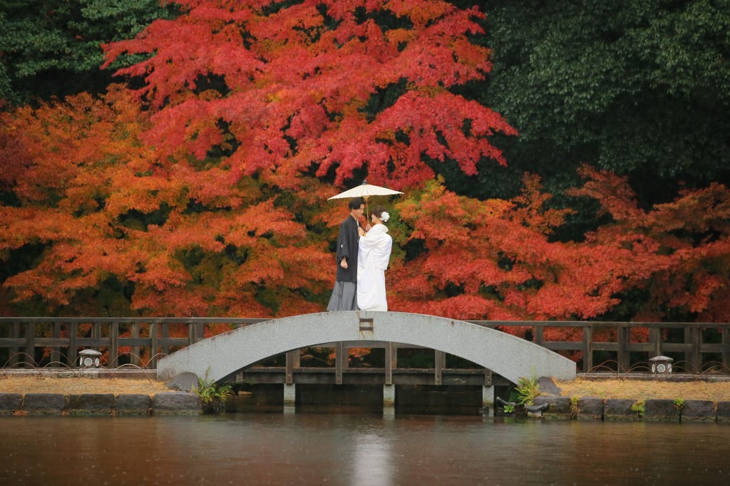 スタジオからお車で10分という都心の中の立地ながら、美しく荘厳な自然景観の中で、和装ロケーションフォトをお楽しみいただけます。庭園内は新緑や紅葉、牡丹や花菖蒲の花々など四季を通じて自然がとても豊かなのも特徴の一つです。