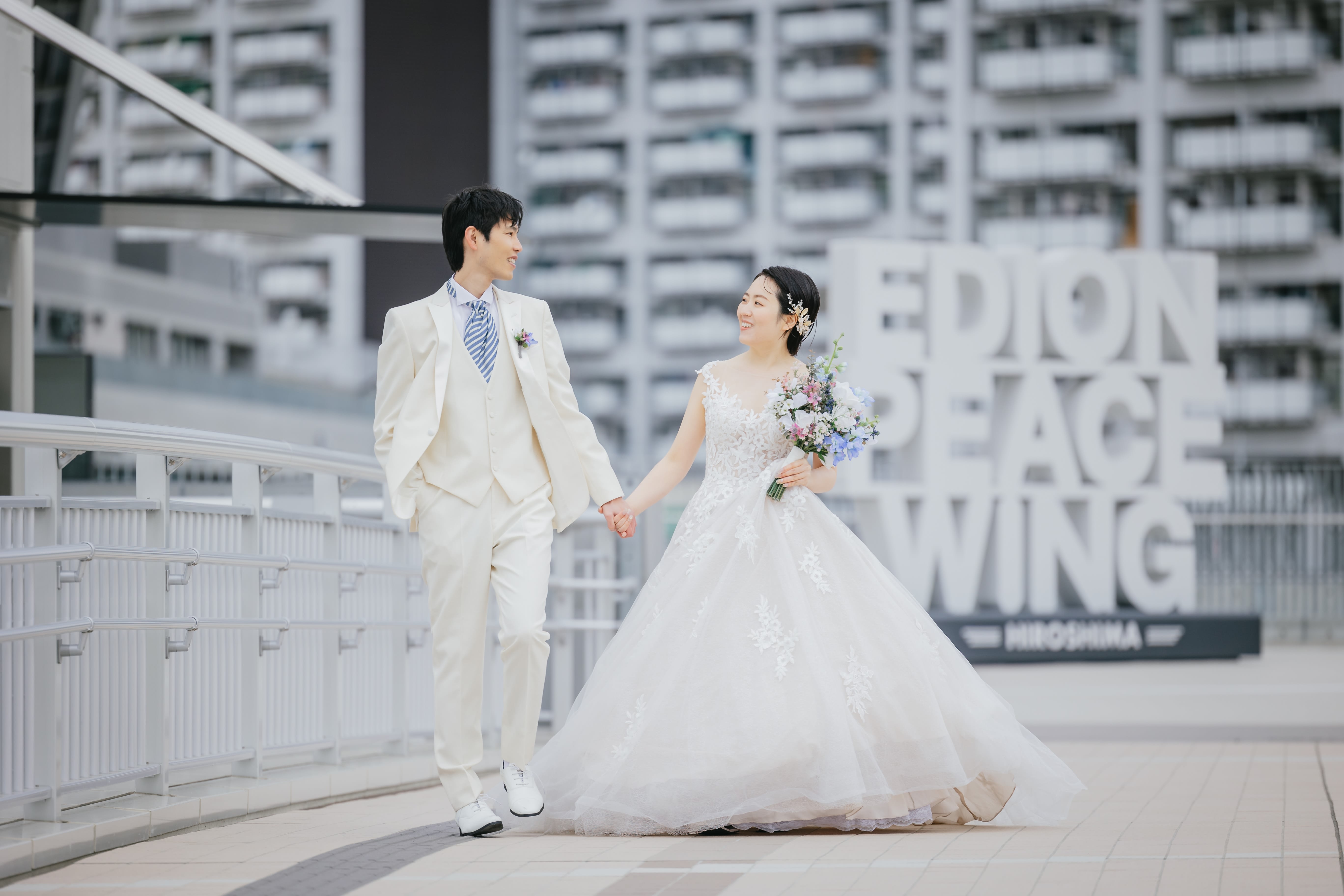 広島市の中心部に位置するエディオンピースウイングは、モダンな建築と広がる緑が魅力です。都会の洗練された雰囲気を背景にした撮影が楽しめます。