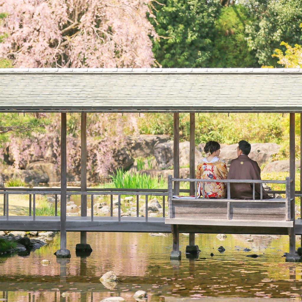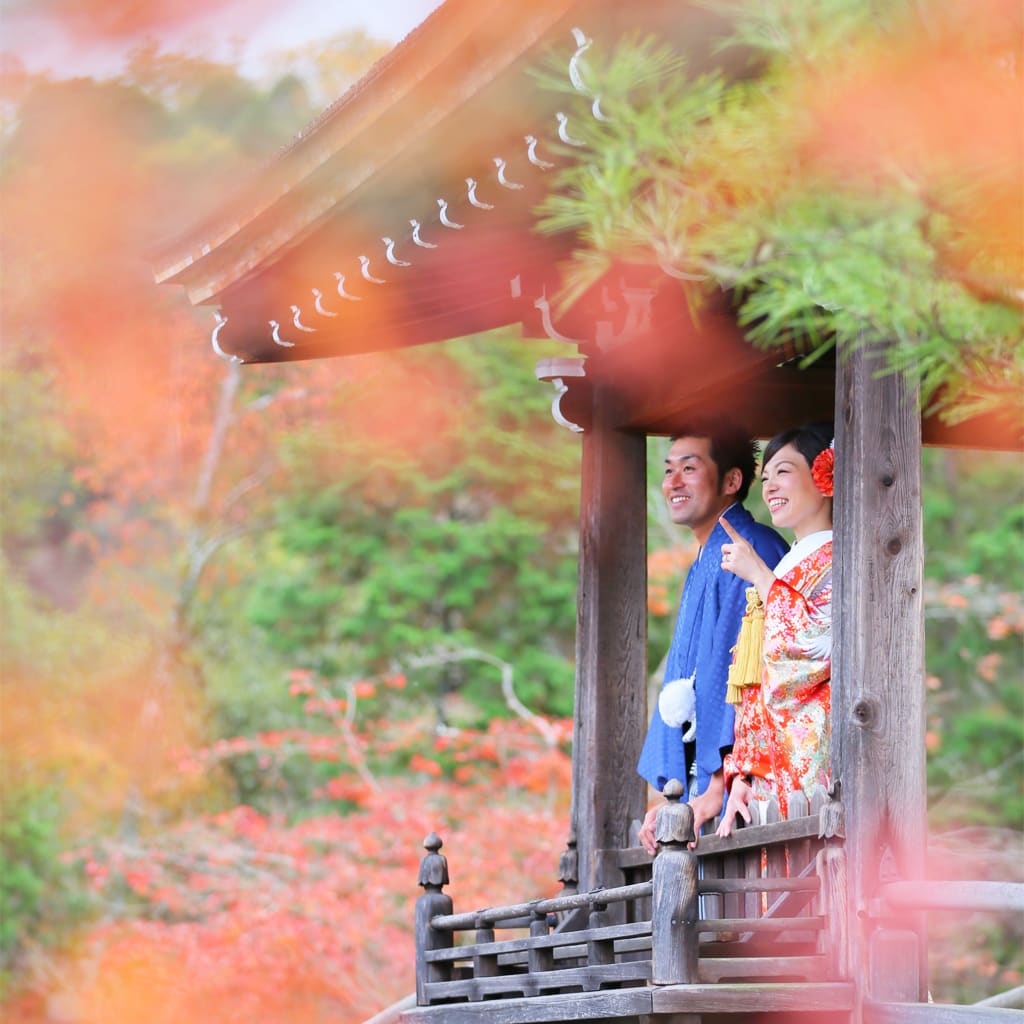 お守りを手にしたポーズや、手水でのシーンを撮影できるのも、神社仏閣ロケーションならでは。参拝シーンを撮影しながら夫婦円満を祈願するのも、縁起がよいですね。敷地内や周辺では自然が豊かなところが多いので、季節を彩る風景との撮影ができるのも、神社仏閣撮影の魅力です。