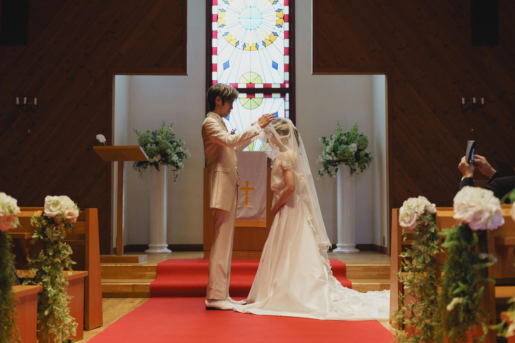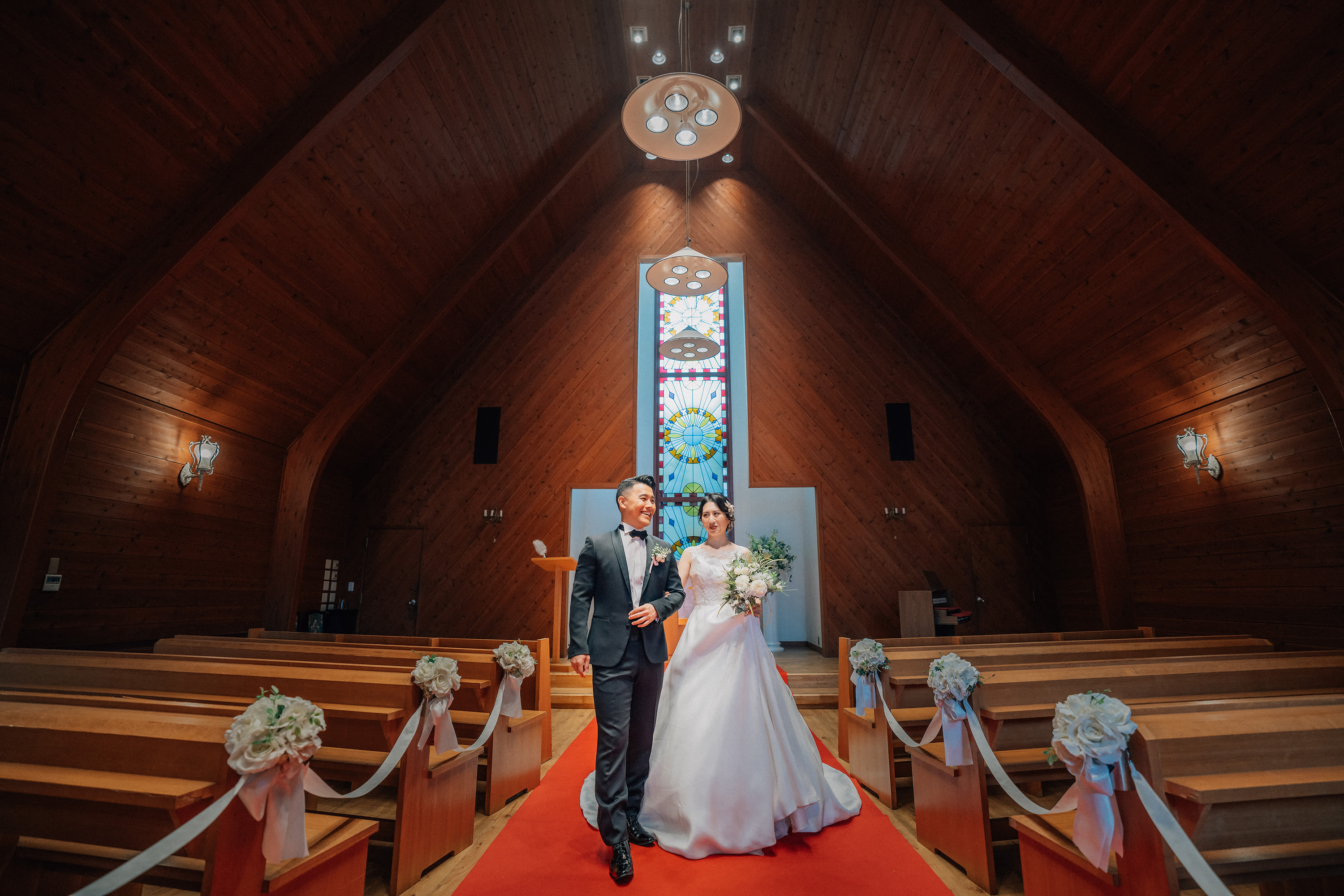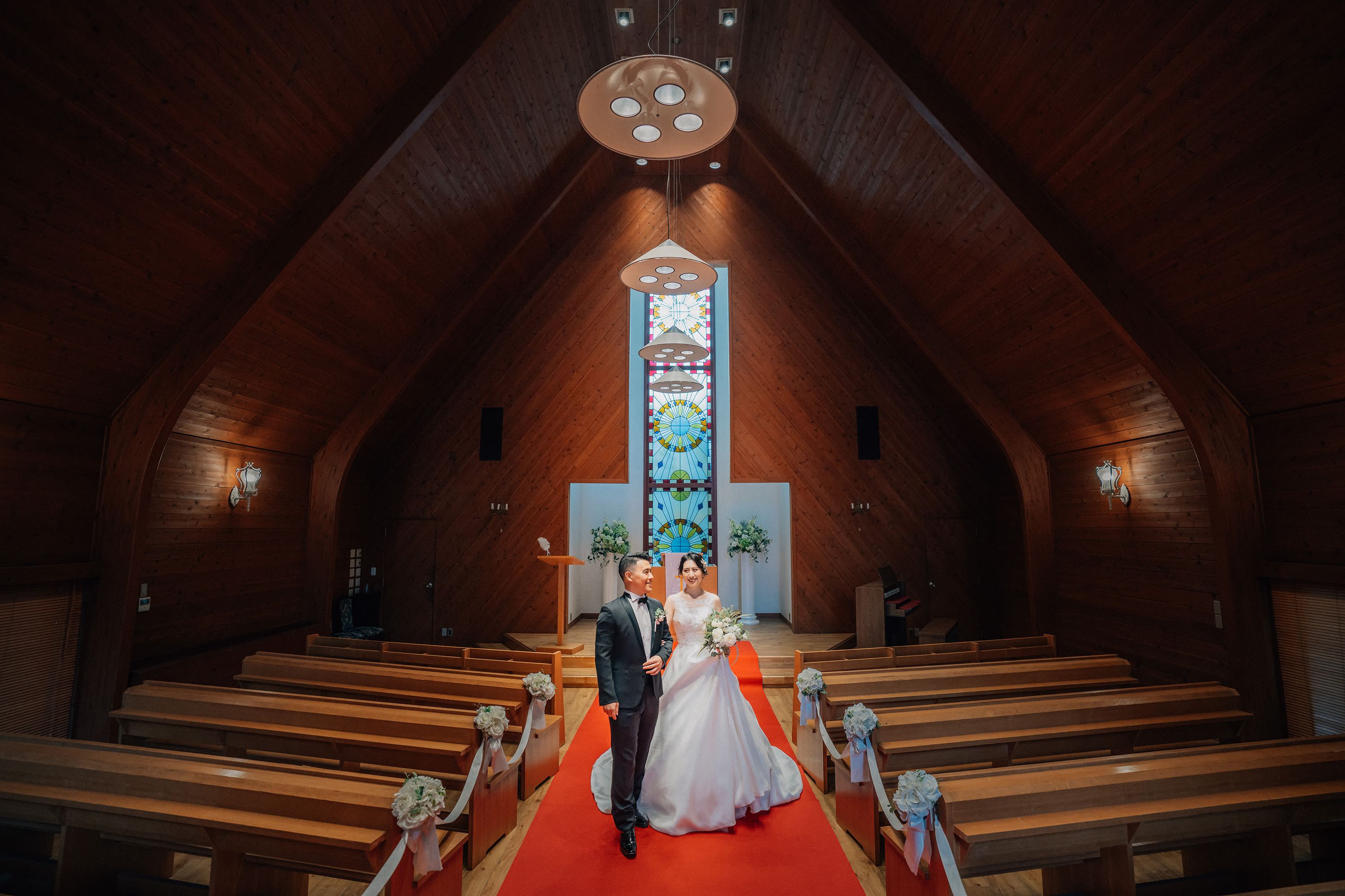 美しいステンドグラスと木の温もりを感じるチャペルでの撮る結婚式はいかがでしょうか。