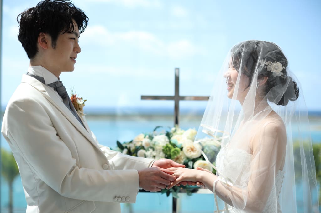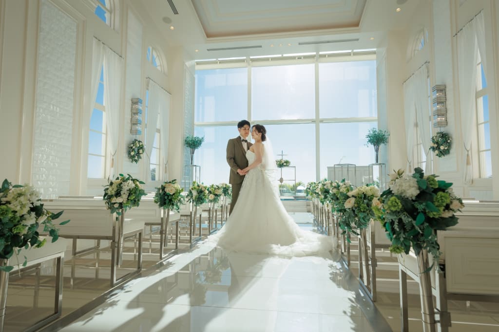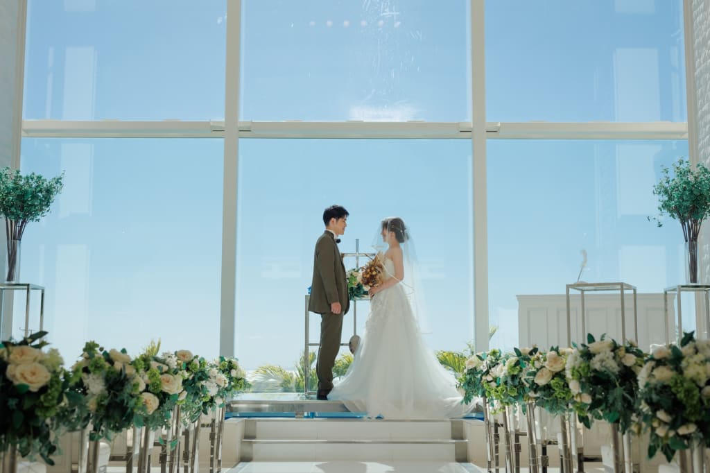 沖縄の美しい海を望む、絶好のロケーションに建つオーシャンビューチャペルでのウェディングフォトプラン。透き通る青空と輝く海、リゾート感あふれる自然の中で、まるで海外映画のワンシーンのような一枚が叶います。チャペルの中では神聖で静かな時間を、屋外では沖縄らしい開放感ある撮影を。