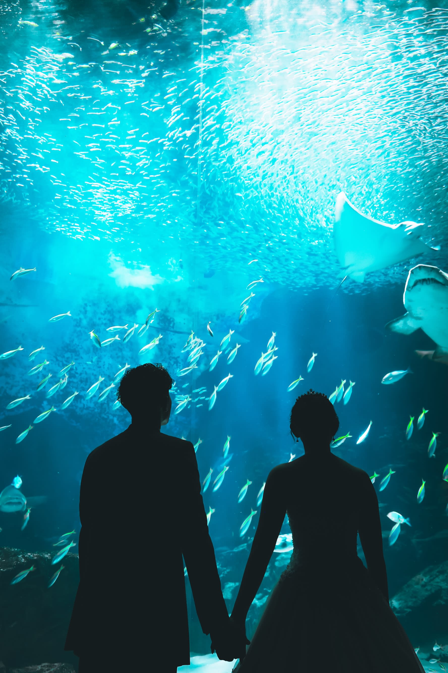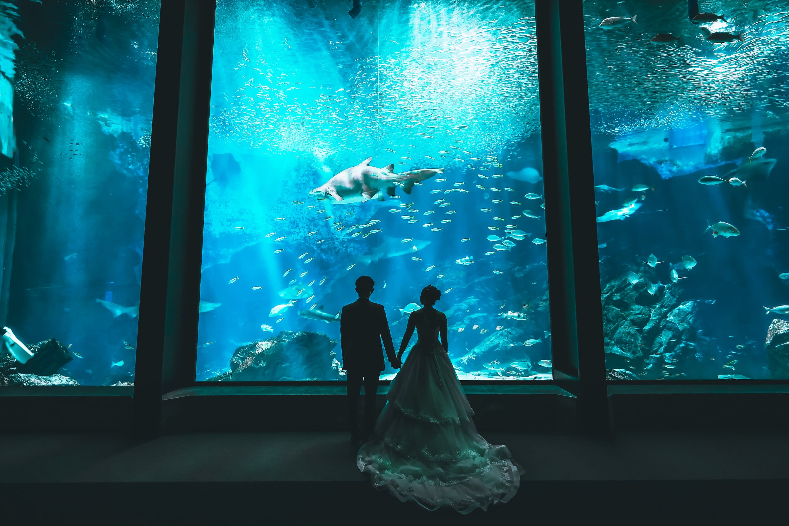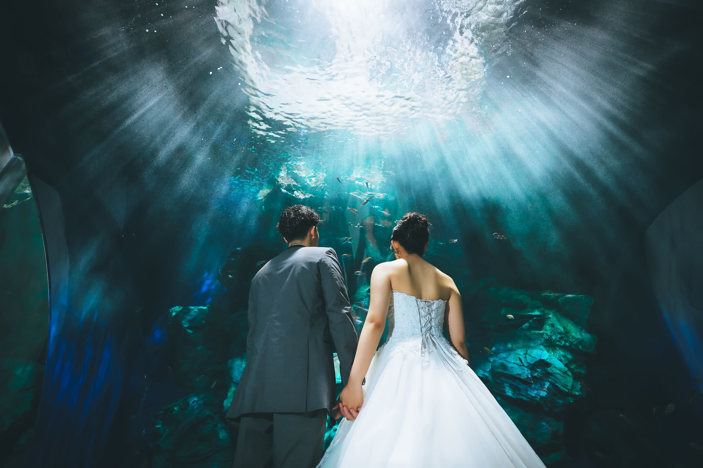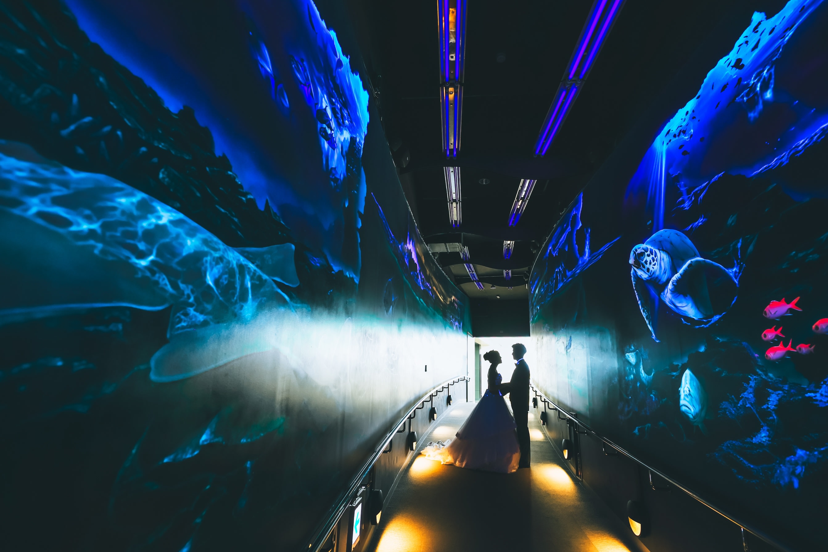 海の生き物や、神秘的な水槽の前での撮影が可能!マリンワールドロケーション。