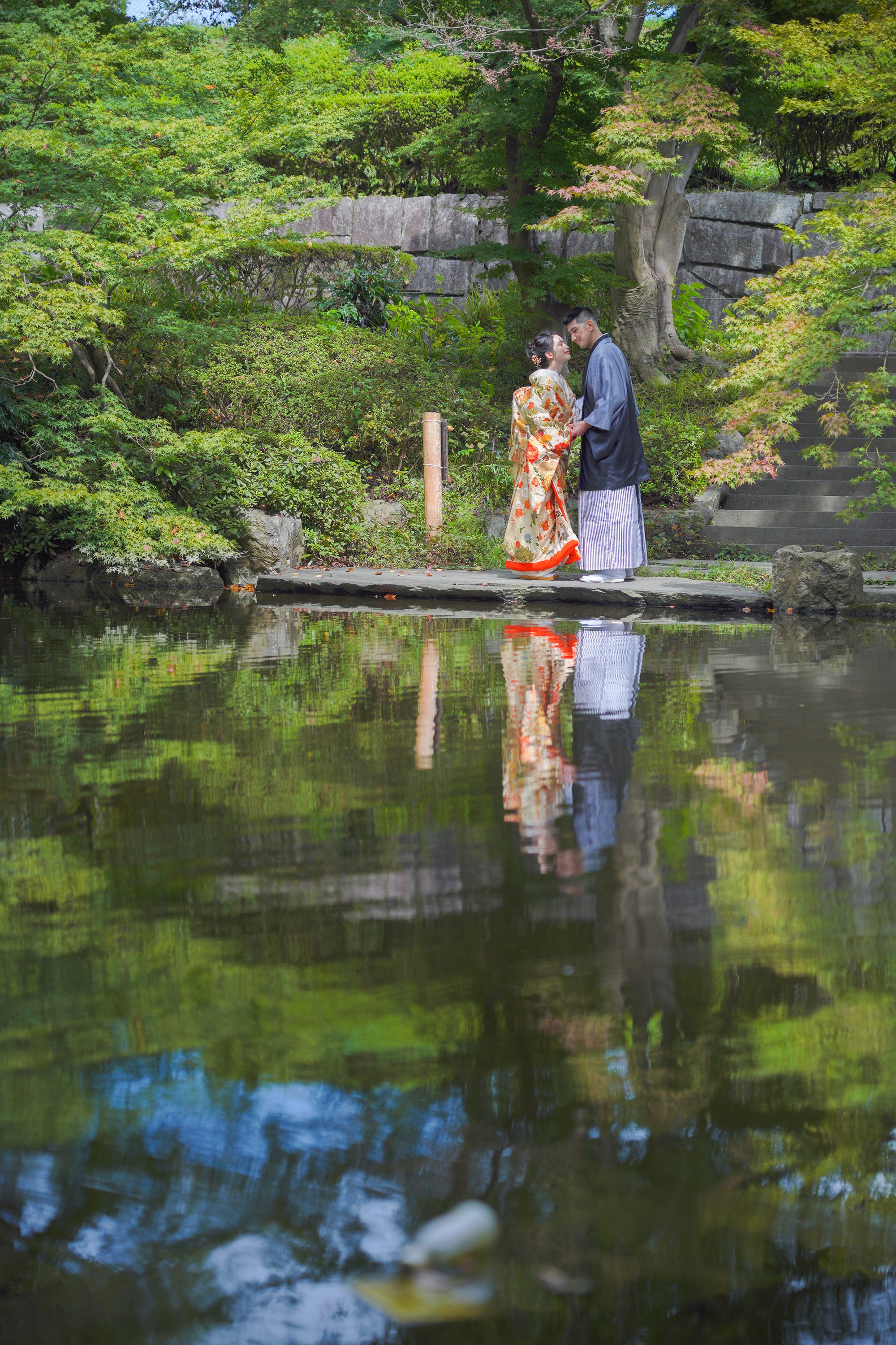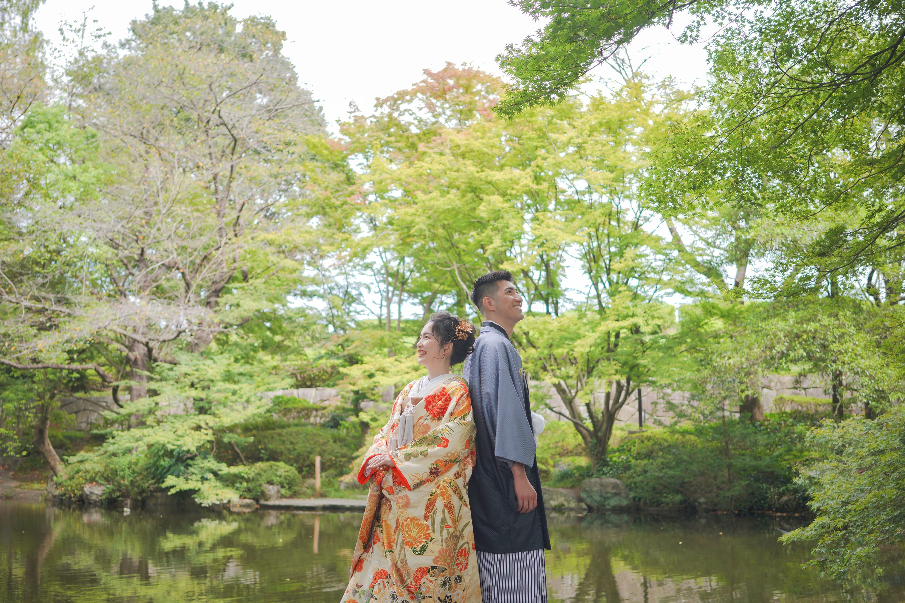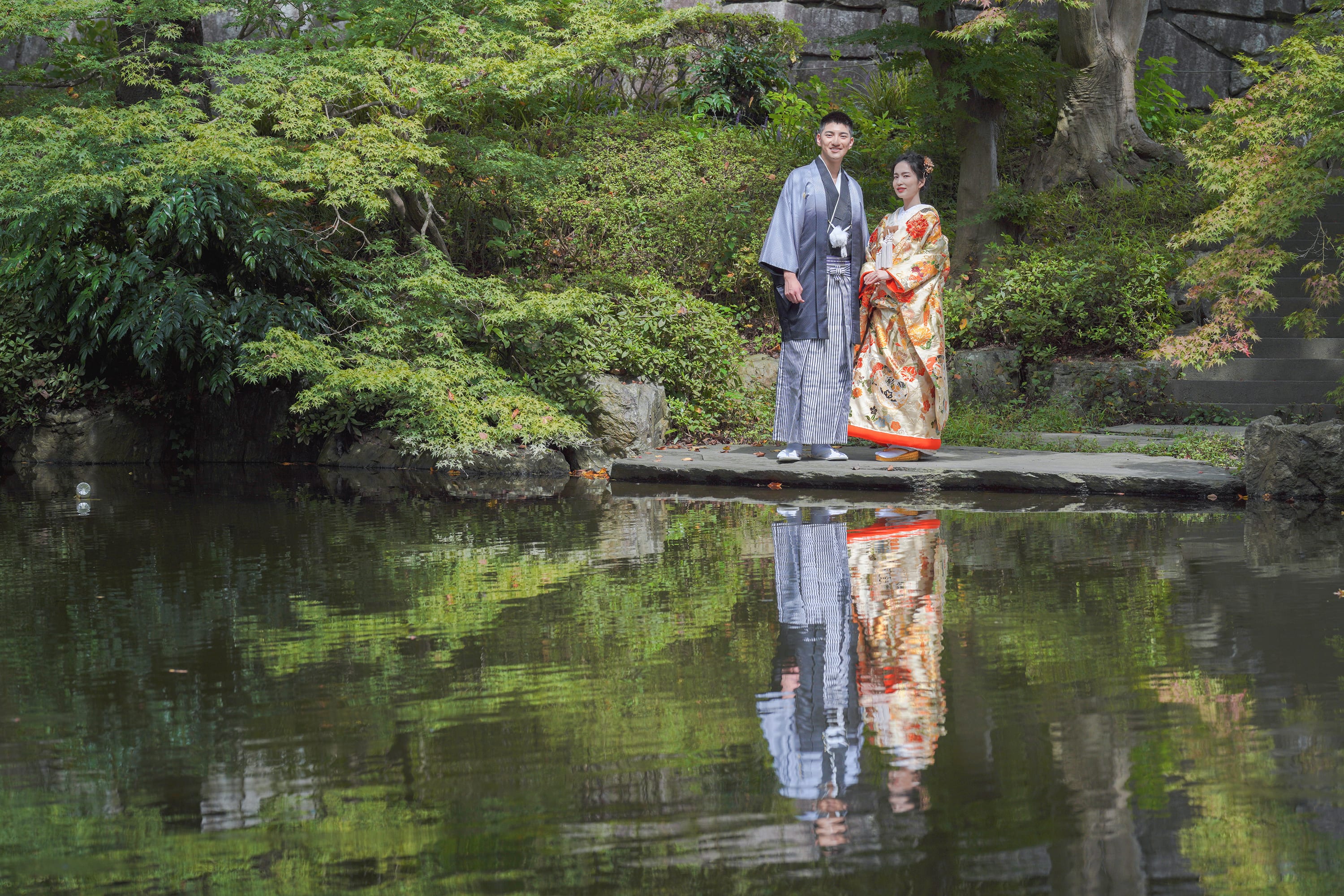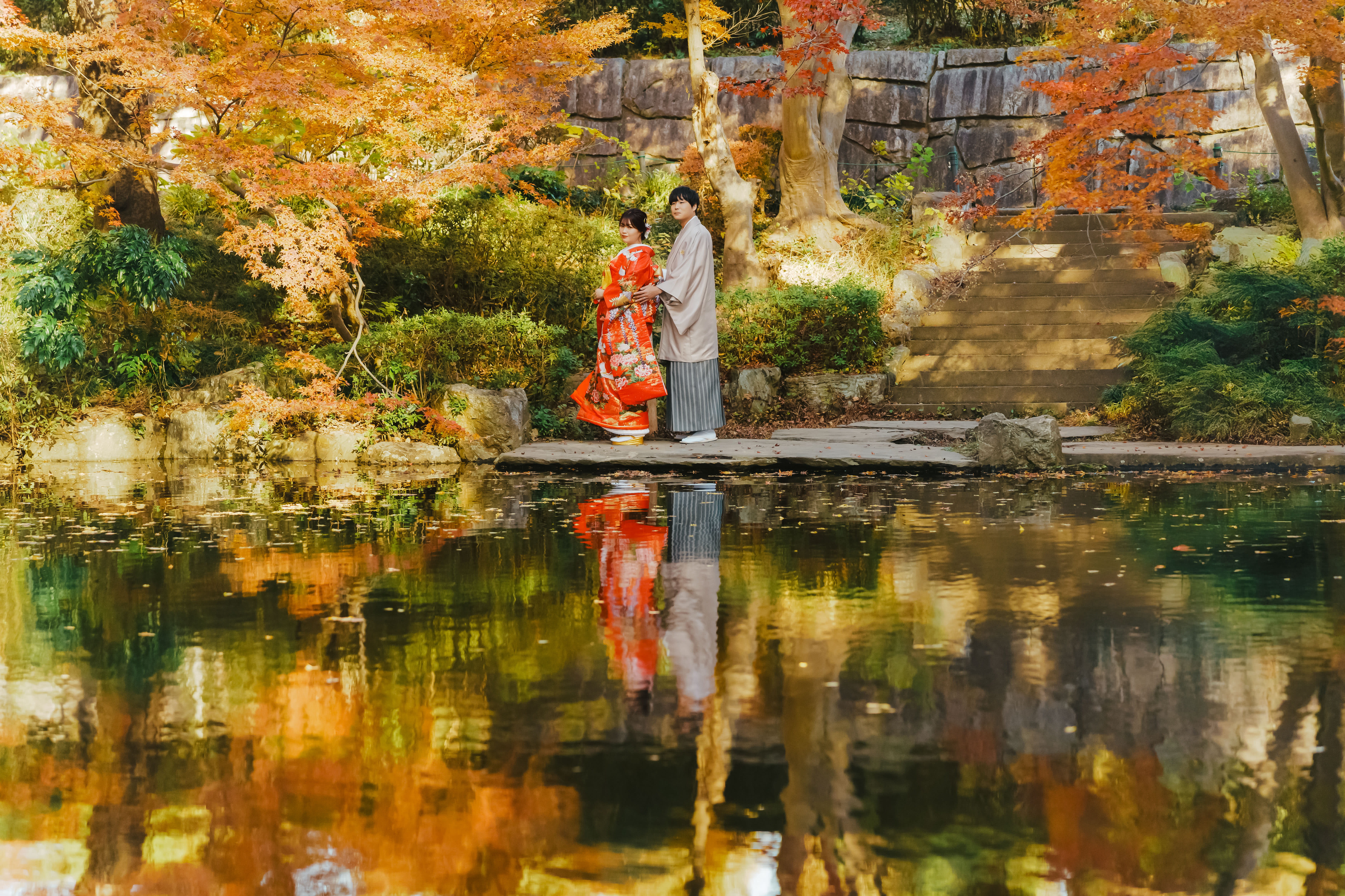 「水と緑の調和」をテーマにした公園。 紅葉や桜が楽しめるので和装におすすめです。