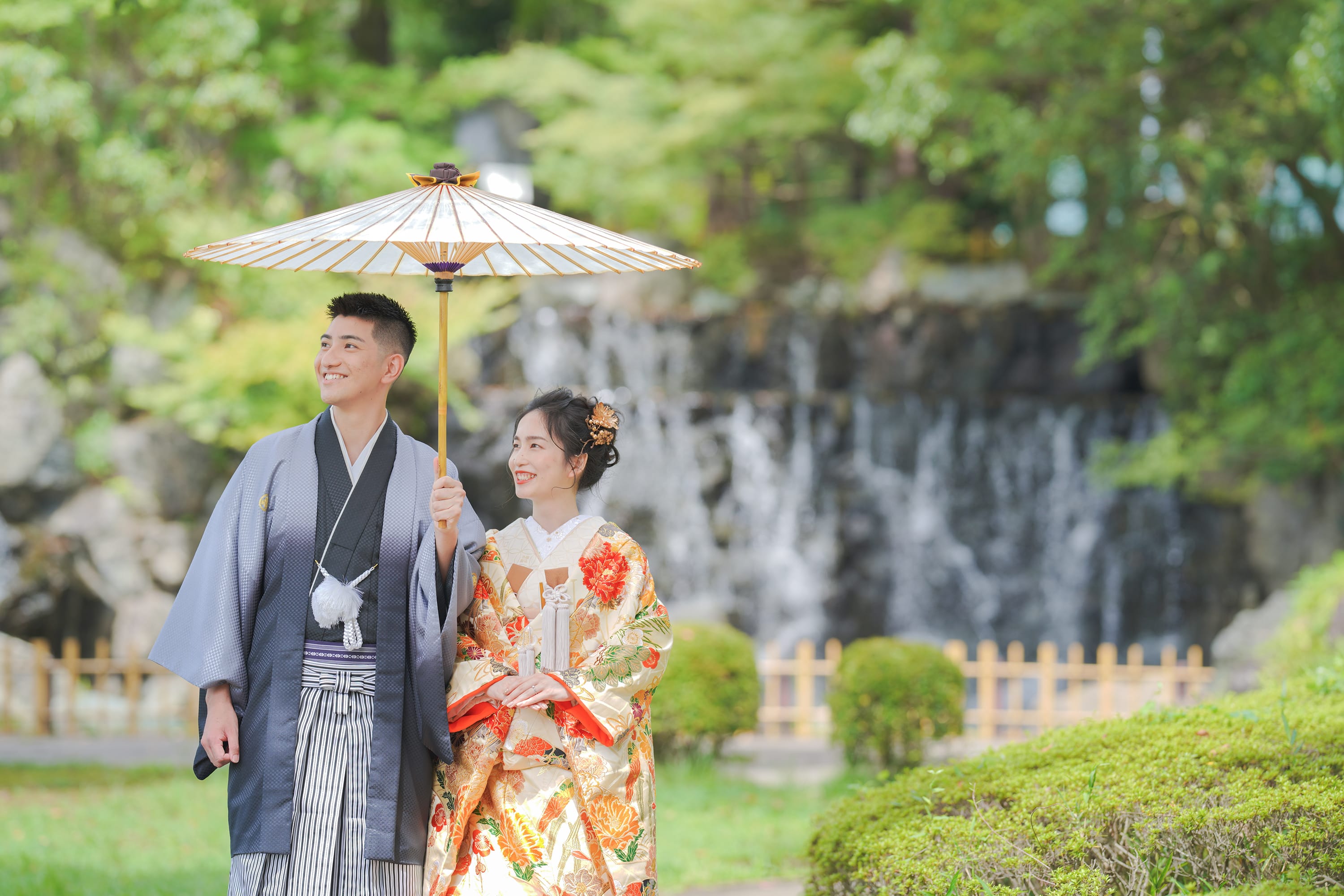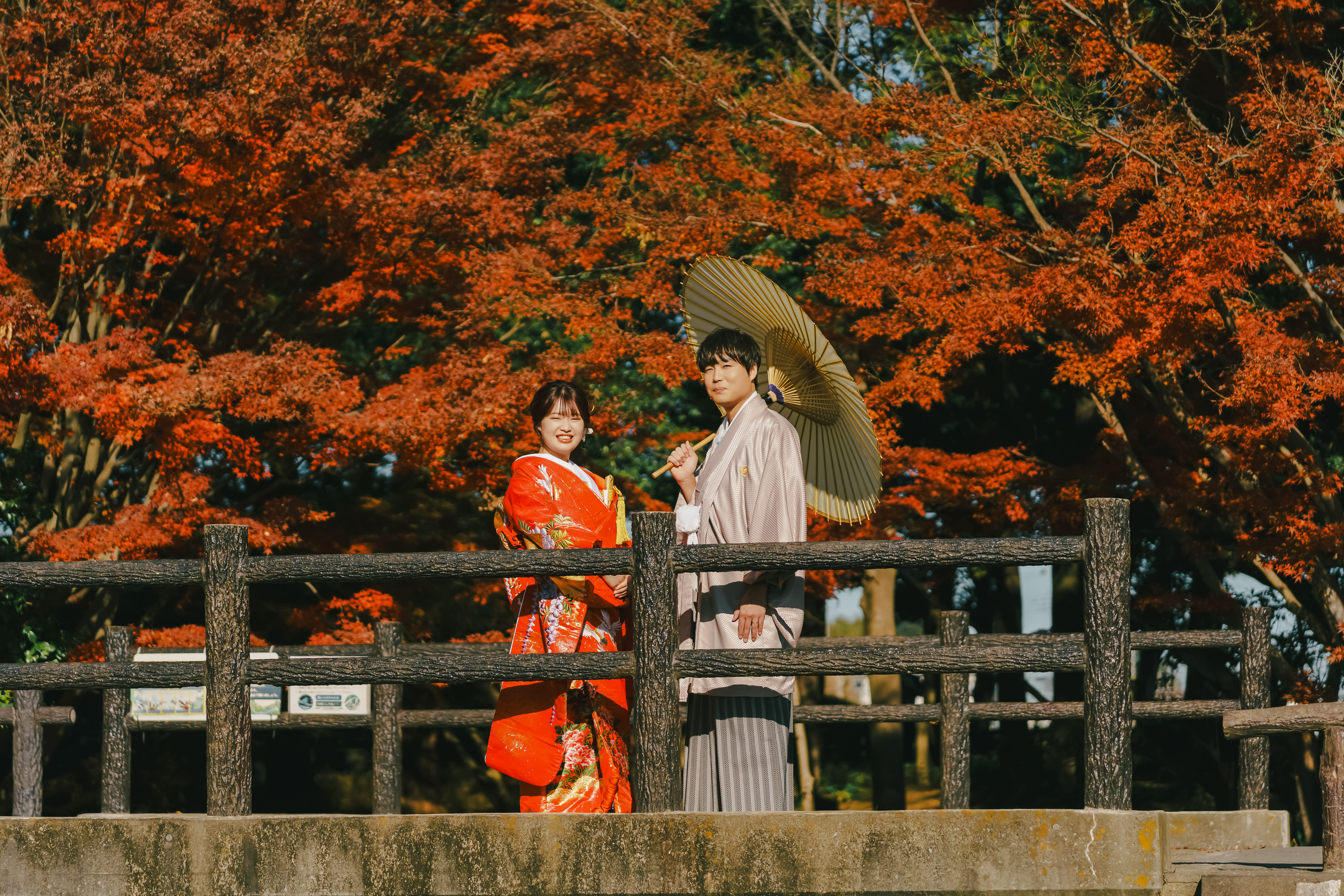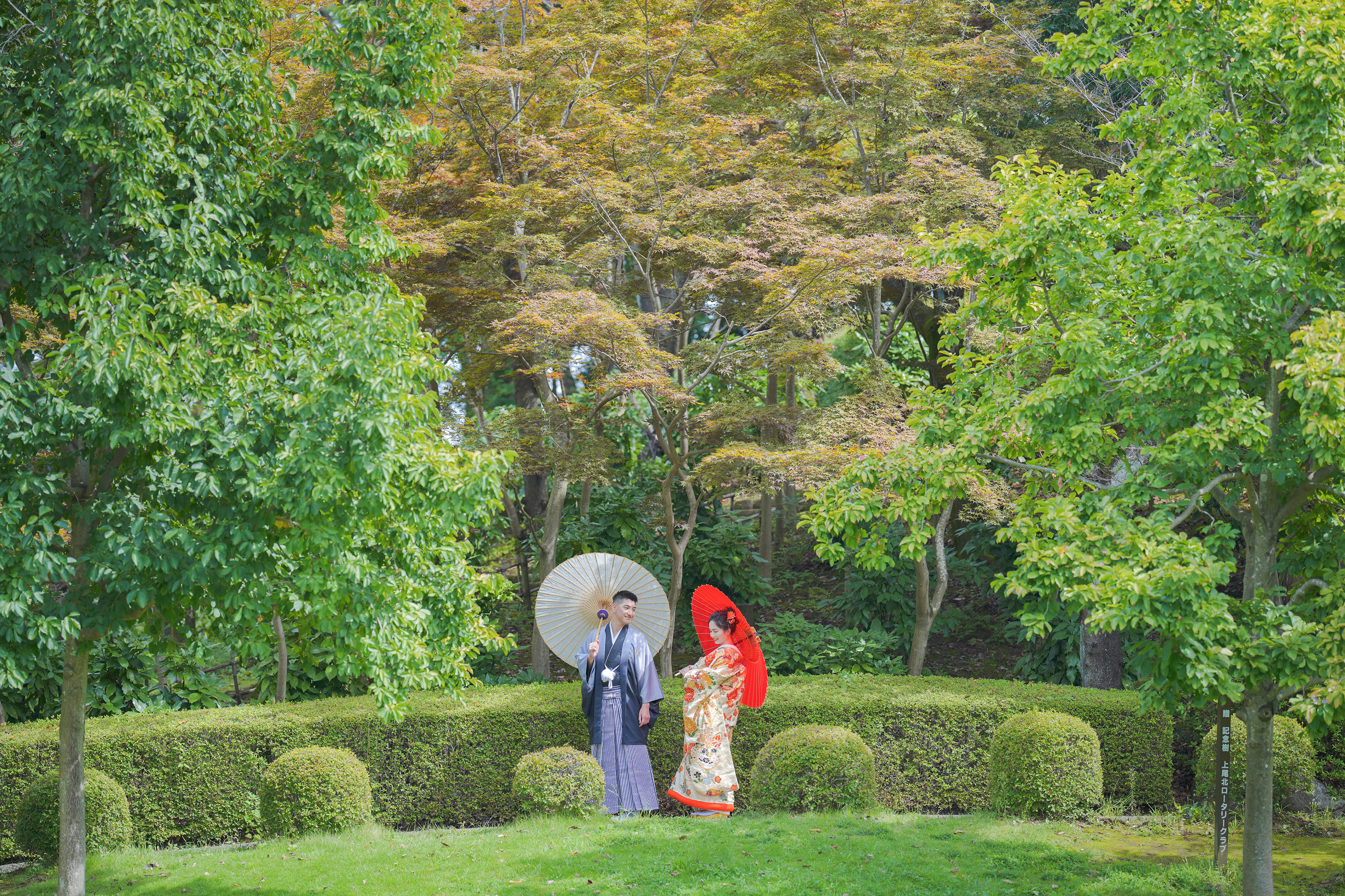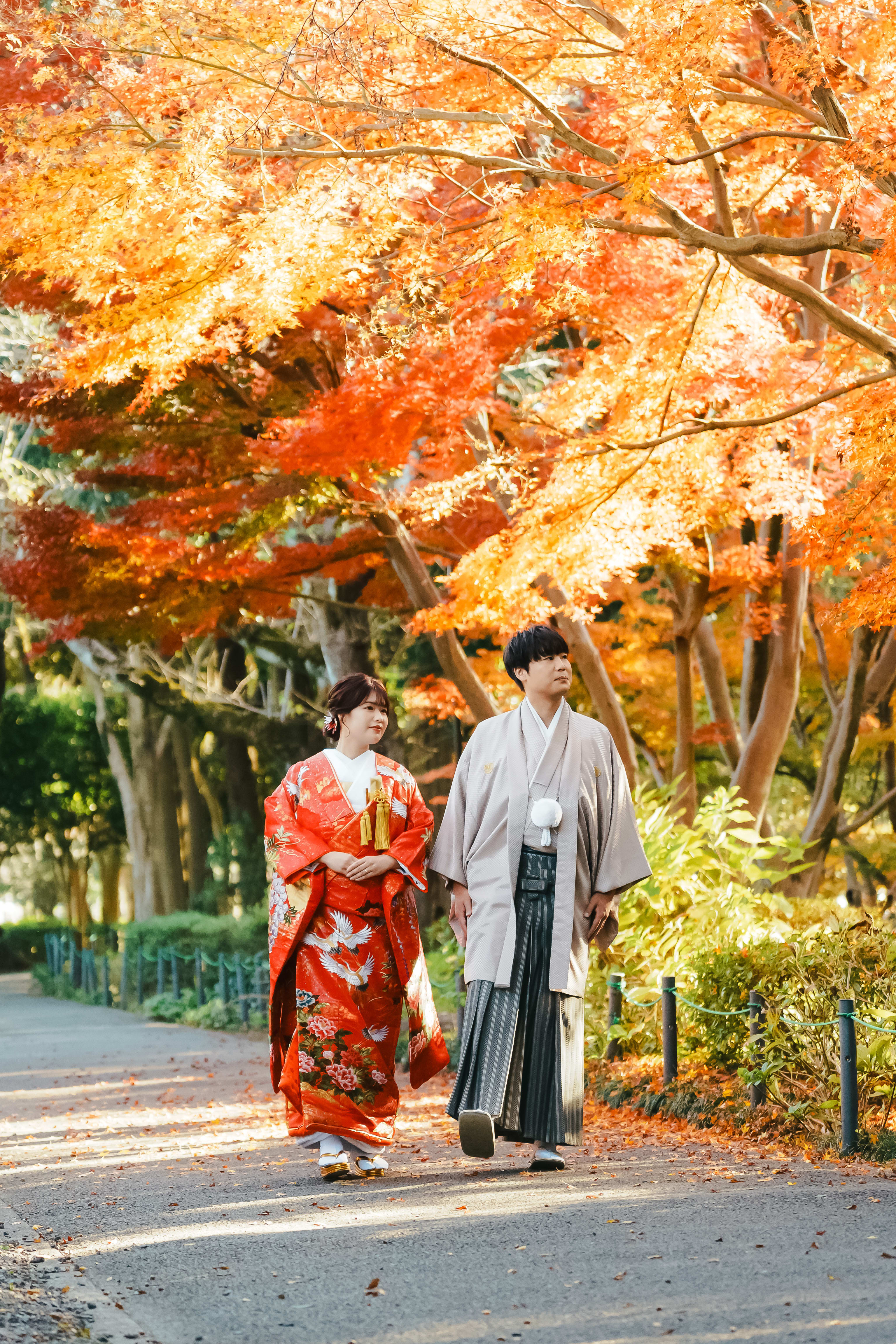 「水と緑の調和」をテーマにした公園。 紅葉や桜が楽しめるので和装におすすめです。
