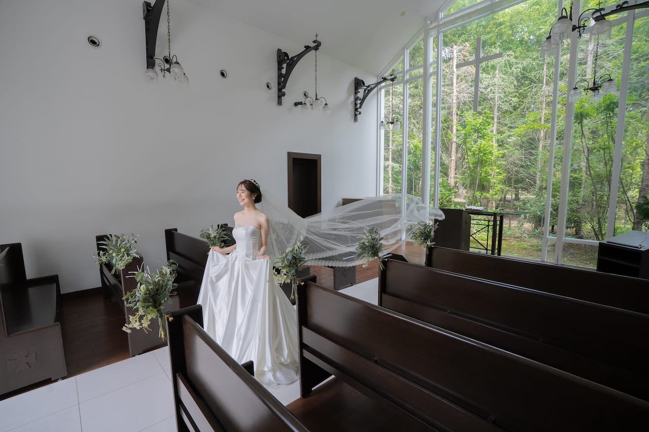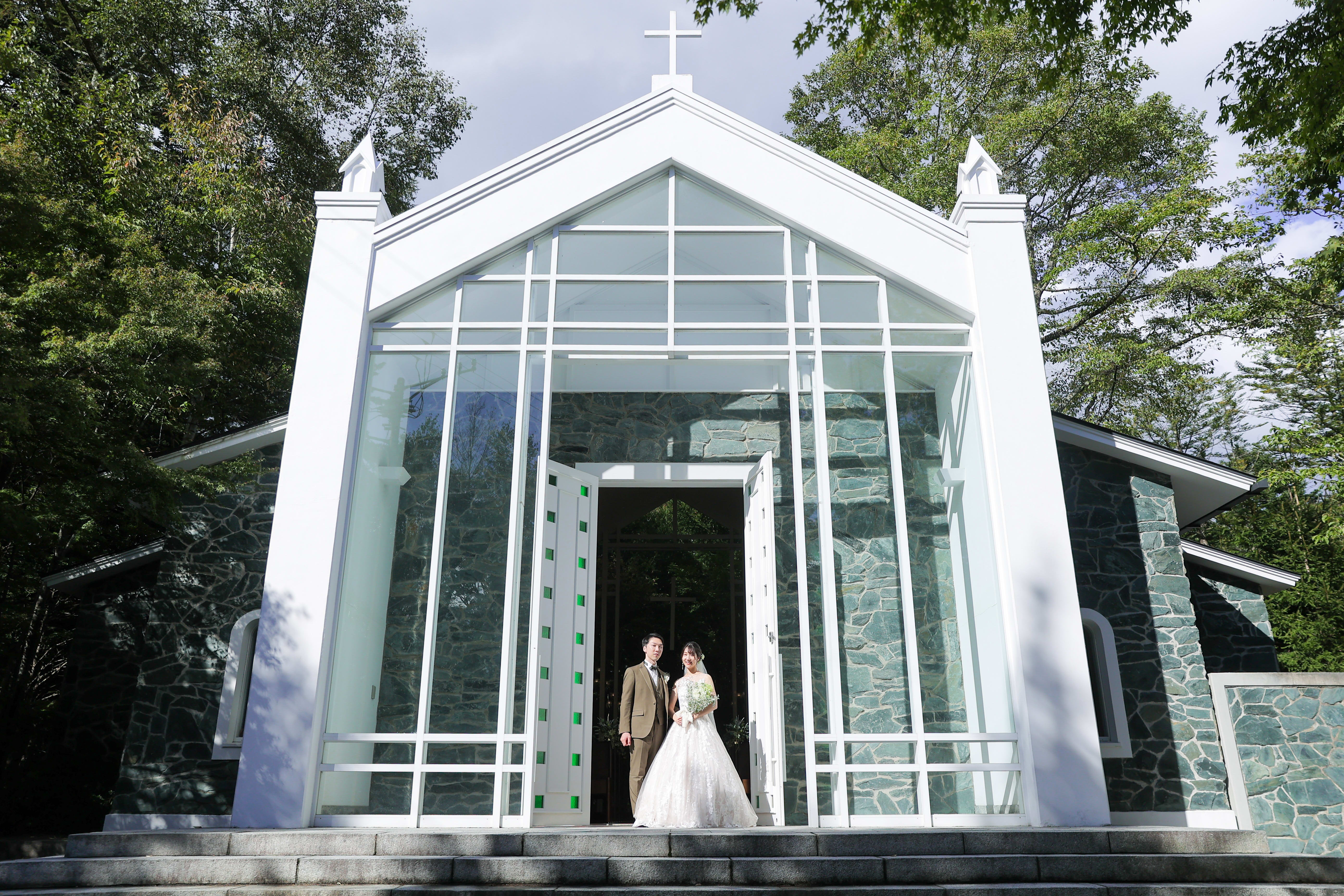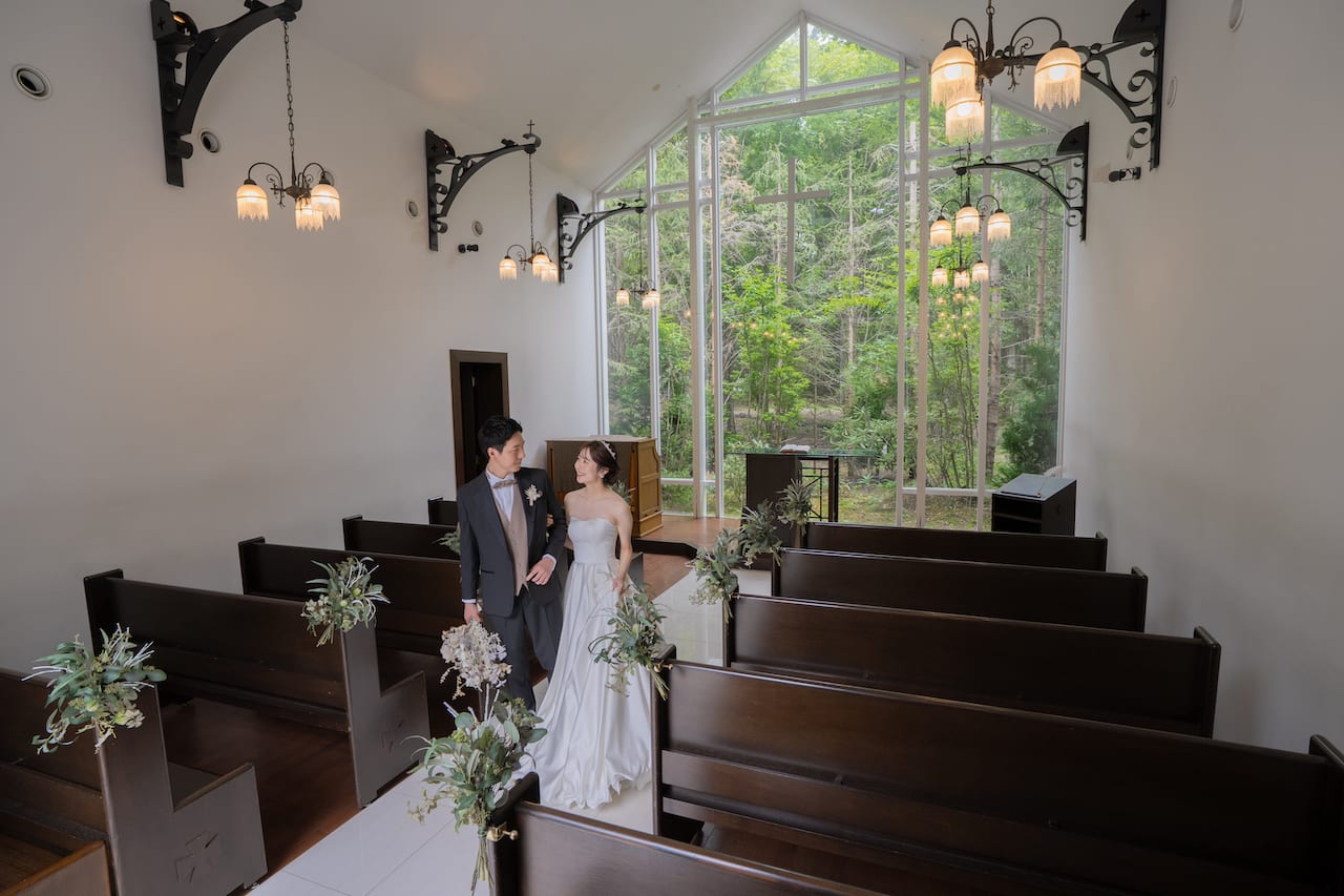 軽井沢らしい雰囲気に包まれた独立型チャペル。天井が高く、正面からは緑が見え写真映え◎!!