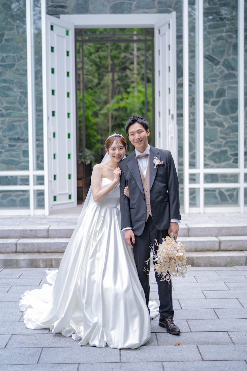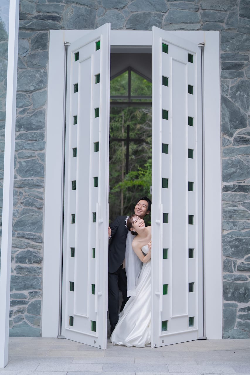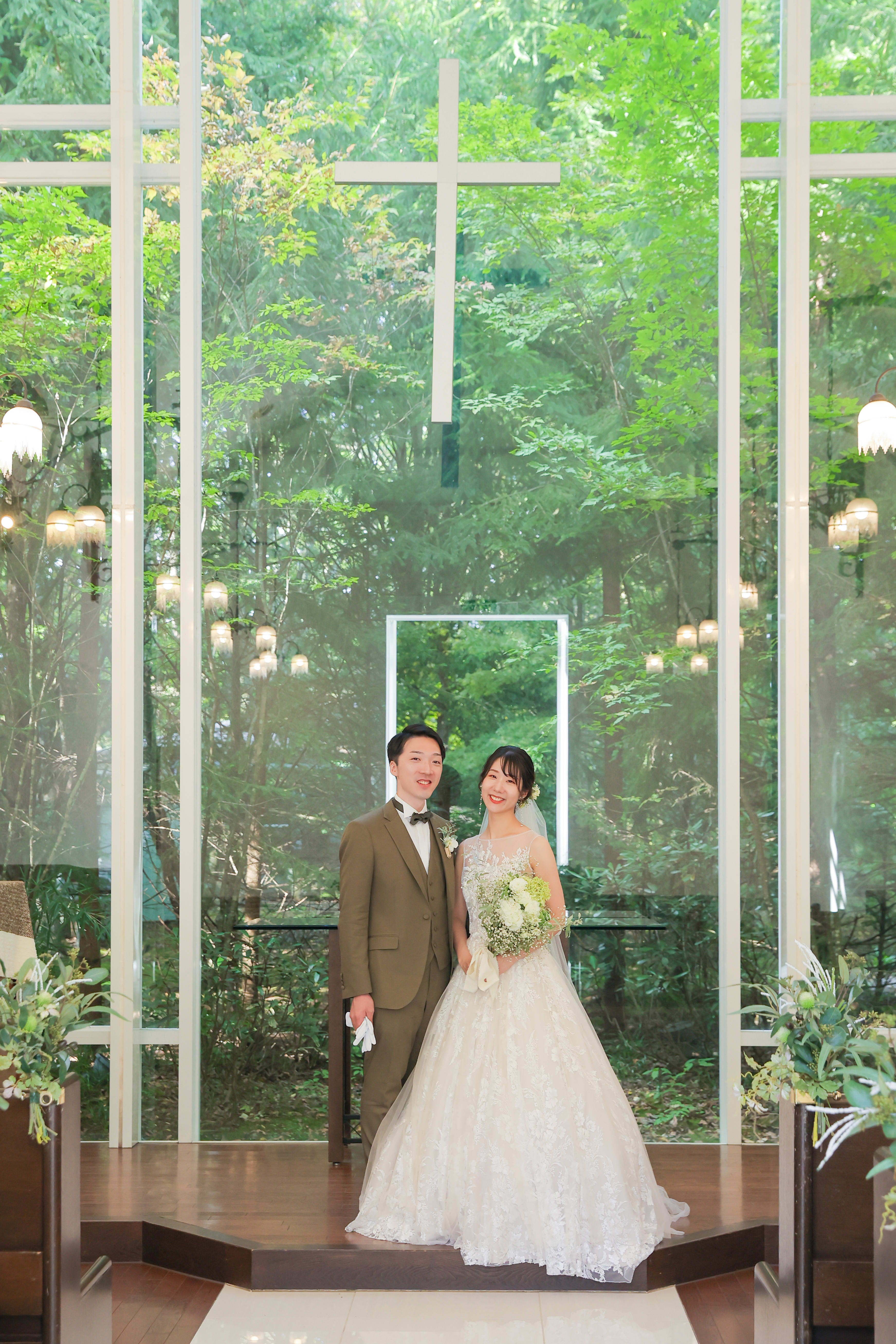 軽井沢らしい雰囲気に包まれた独立型チャペル。天井が高く、正面からは緑が見え写真映え◎!!