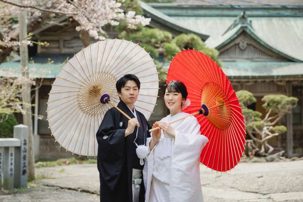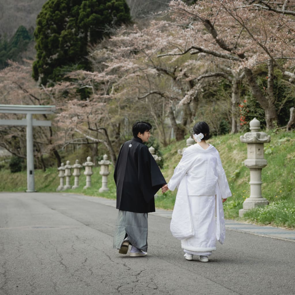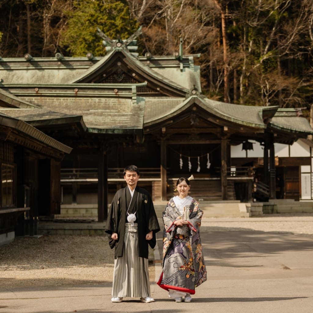 「聖帝八棟造り」の本殿は、歴史を感じさせる厳かな雰囲気で、伝統的な和装での撮影に最適です。