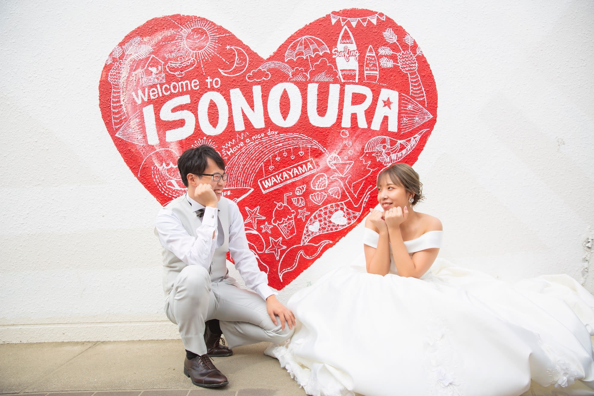 サーファーが集まるマリンスポット、磯ノ浦はおふたりの特別なブライダルフォトにもばっちり!青い海のバックに砂浜での撮影はきっと世界で一枚だけのお写真が出来上がること間違いなし。ロマンティックな撮影には夕暮れ時もおすすめです。