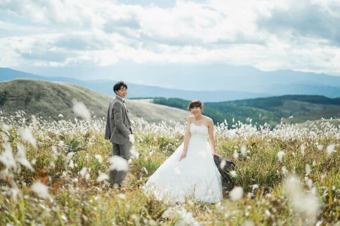 視界いっぱいに広がる花畑にかこまれた、スイートなウェディングフォトに