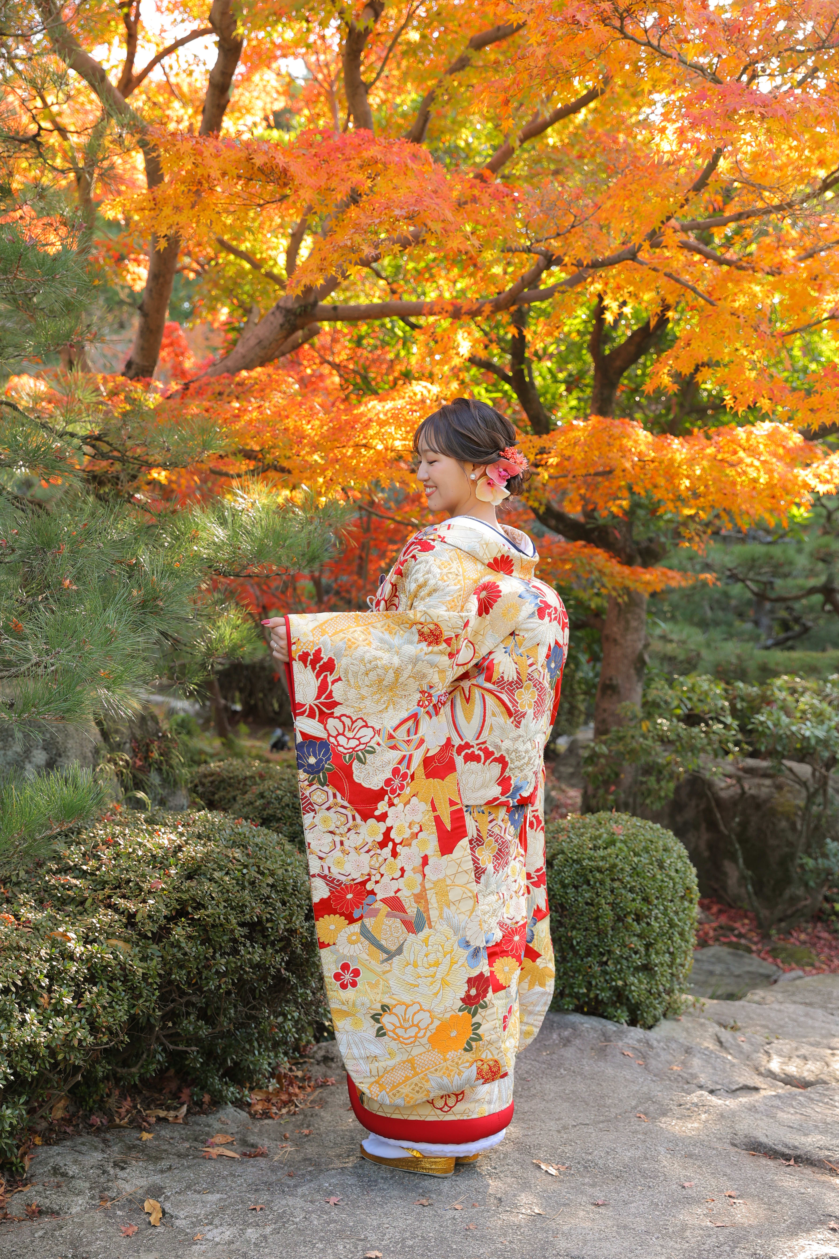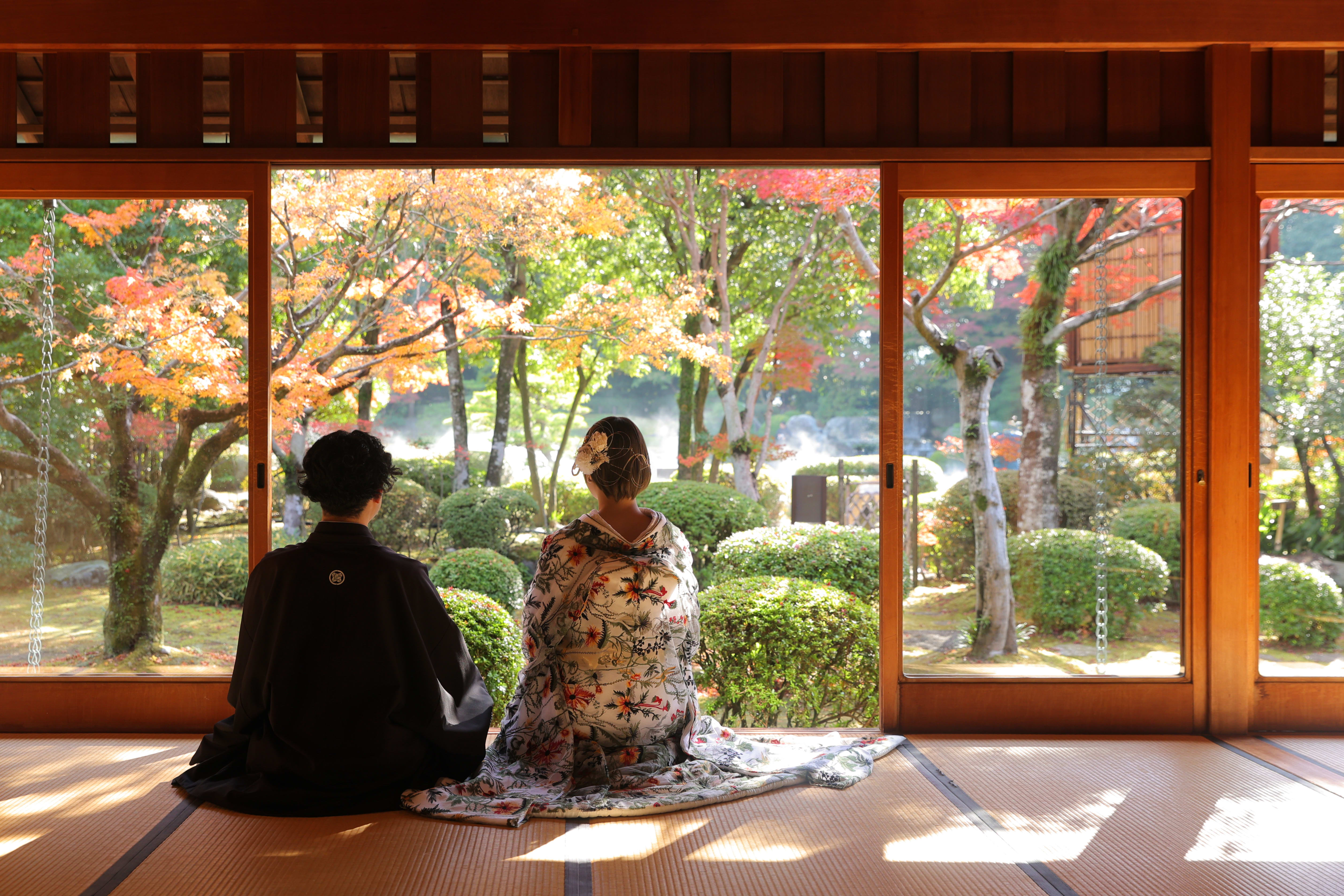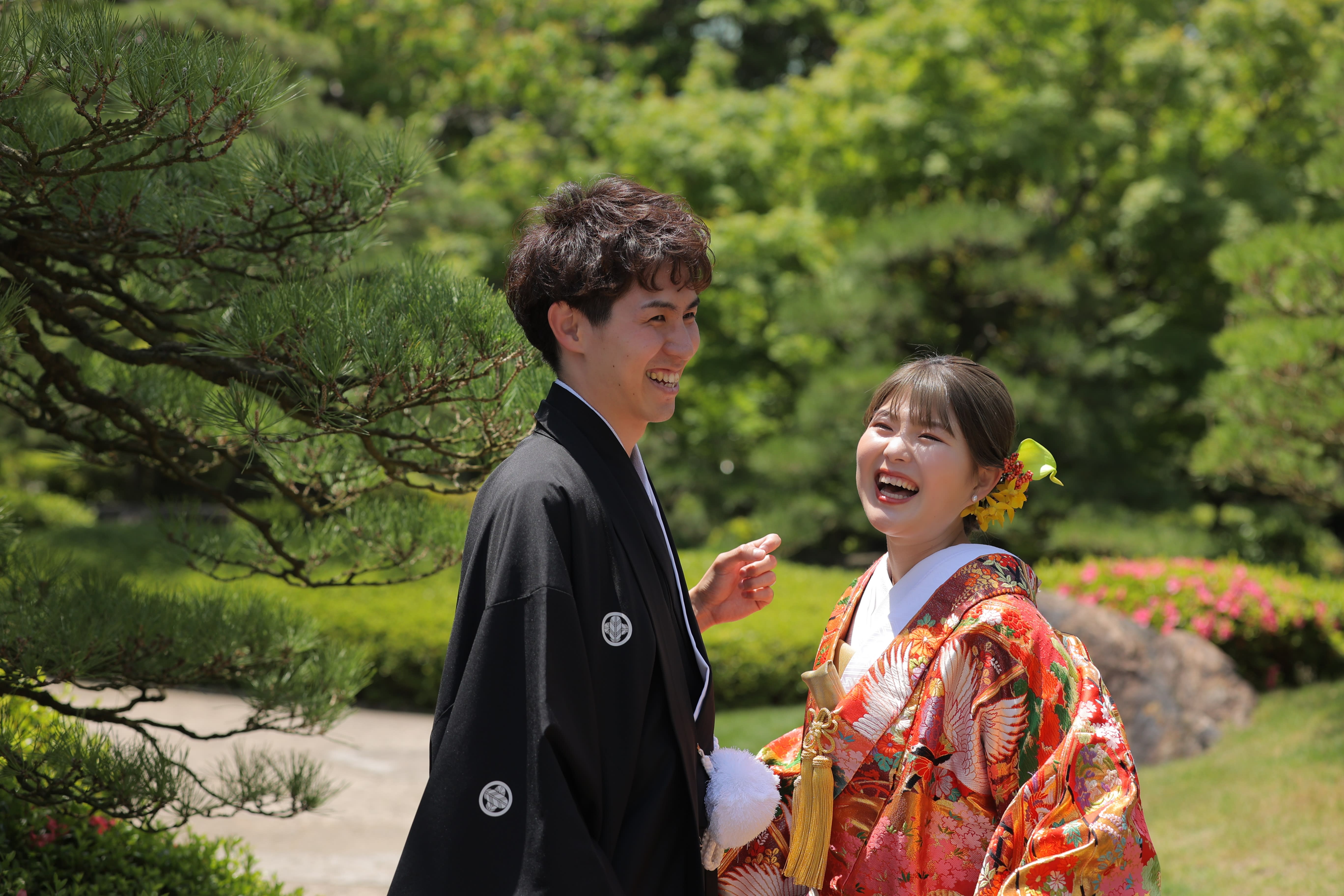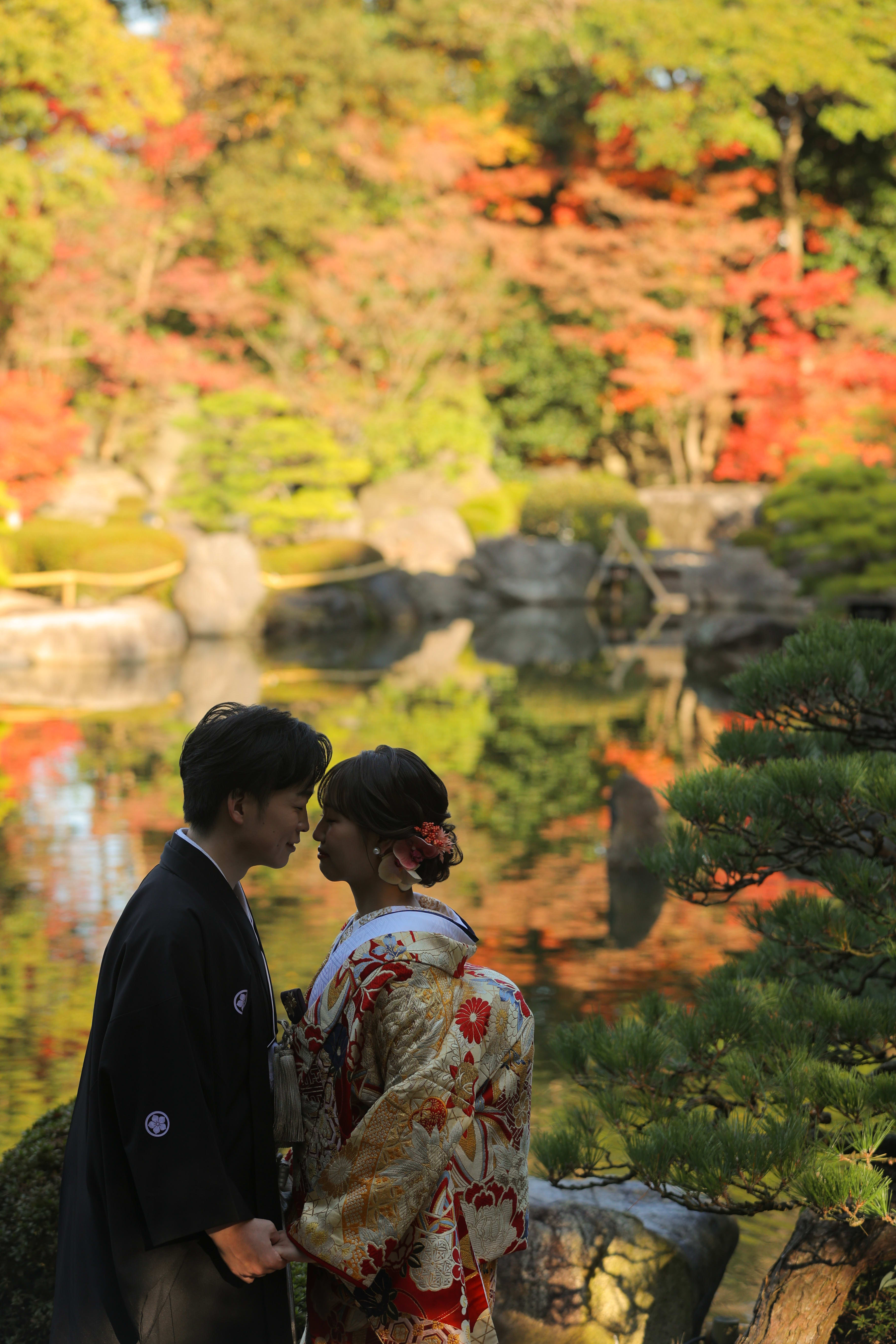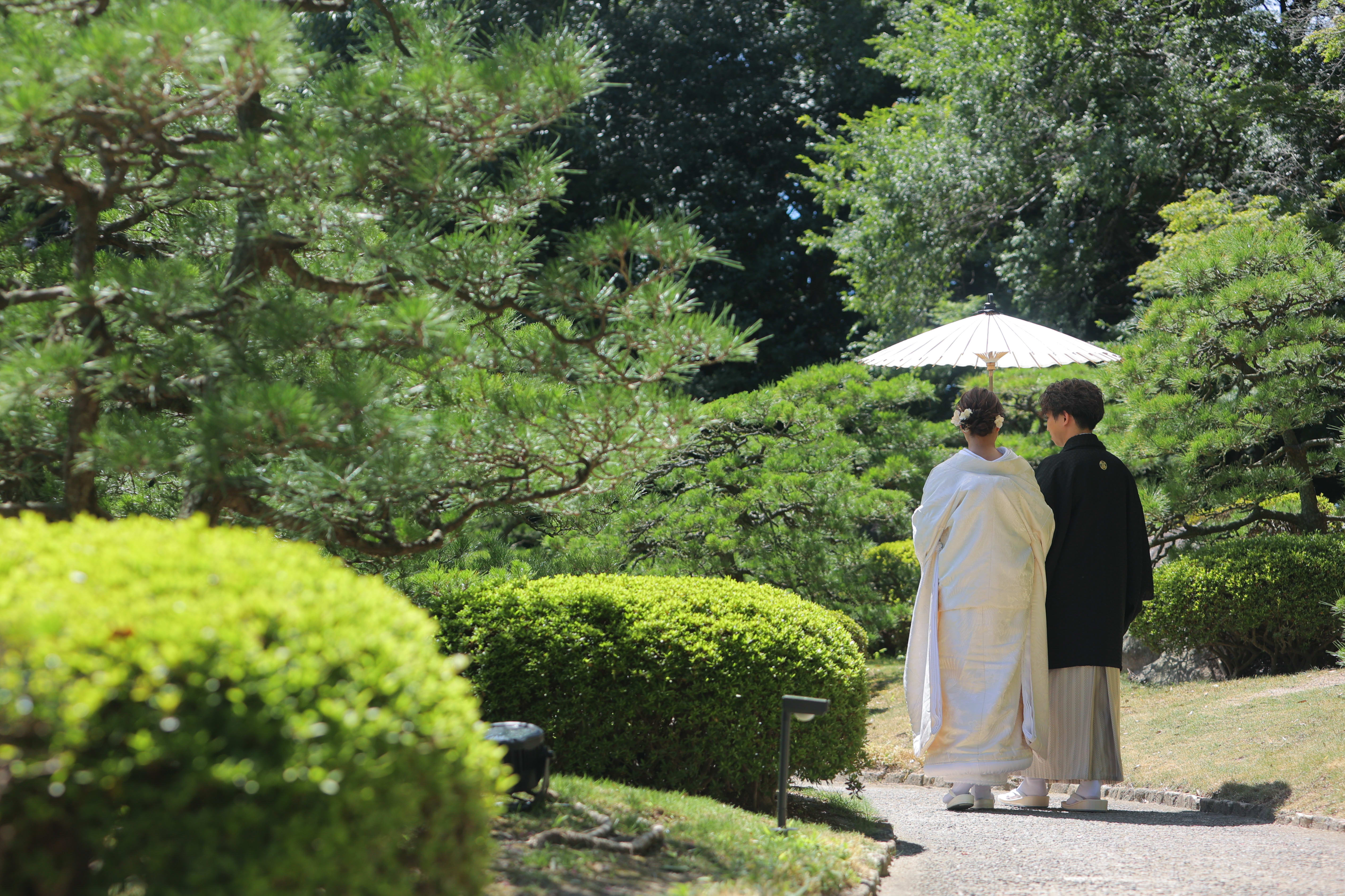 こんにちは!カメラマンの鶴です。 先日撮影させていただいた大濠日本庭園のお庭での写真をご紹介します♪ [大濠日本庭園のお庭の真ん中で、相合傘のおふたり。ロケ地演出の霧のお陰で雰囲気の良さが増します。] [青紅葉の中、池を眺めるおふたり。幻想的でステキです。] [池の中心に立つおふたり。紅白の和傘が一際、目を引きますね。] [落ち着いた表情もいいですね。背中合わせかっこいいです。] [緑の中に白無垢姿のご新婦様。赤比翼がより映えますね。] [ご新婦様のアップ。振り返りの表情とてもかわいいです♪] [和傘でジャンプ!!弾けた表情もしっかり撮れています!!] [夏の風物詩「風鈴」と和装姿のおふたり。風情がありますね。] [ご持参いただいた扇子と一緒に。おふたり寄り添った姿。] [大濠日本庭園を眺めて。ご新郎様がご新婦様を支える姿を後ろから撮らせていただきました。]
