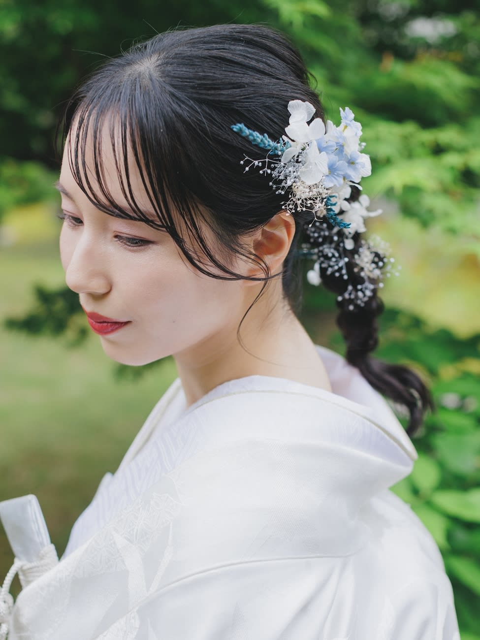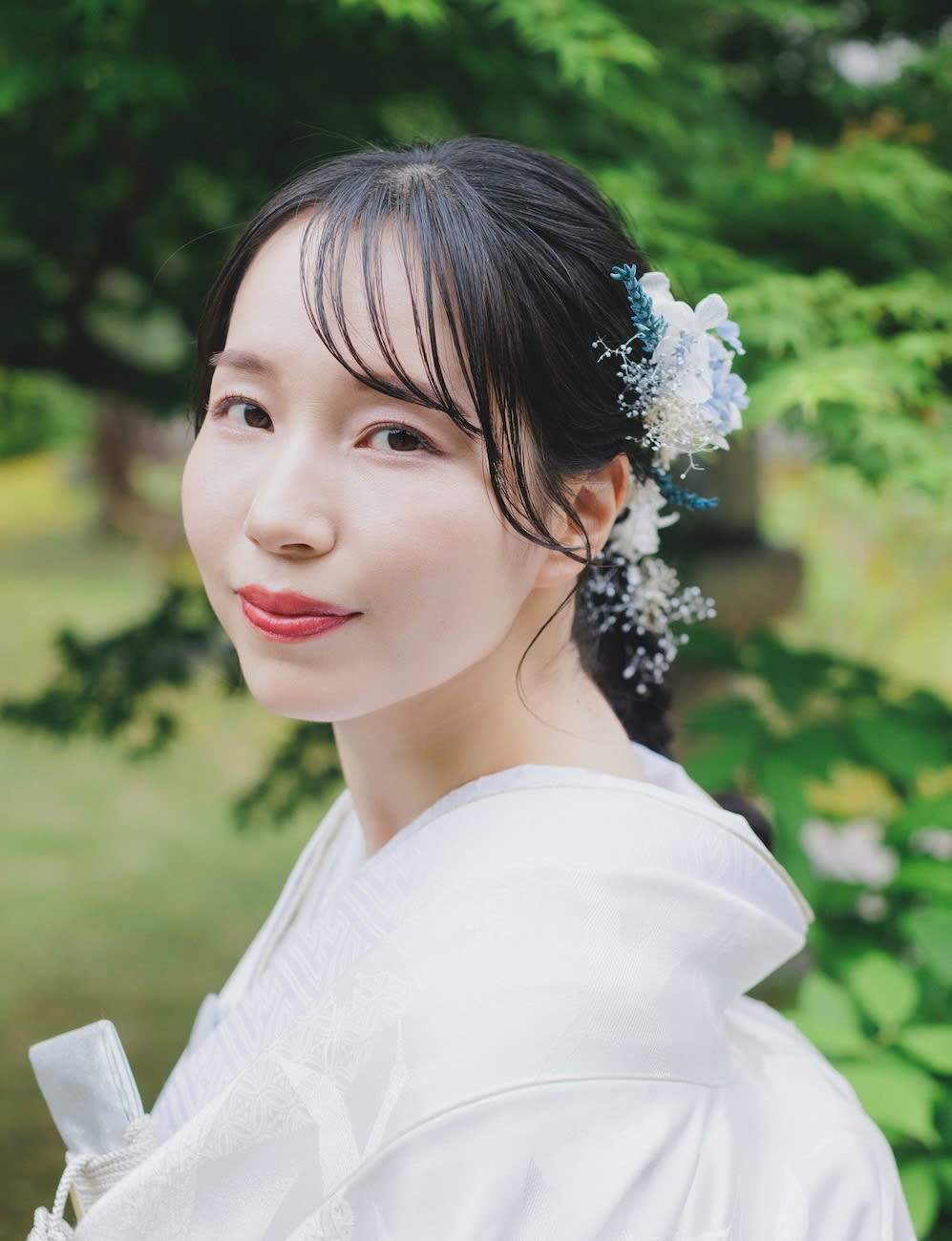 ヘアメイクの谷内です。 たまにお髪の短い花嫁様から、 「この長さでも大丈夫ですか?」と 質問を頂く事がありますが、 ショートスタイルでも全然大丈夫です! 今回は、ショートヘアが とっても素敵なご新婦様を ご紹介させて頂きます。 [写真①.jpeg] 襟足スッキリのショートヘアが 本当にお似合い! [写真②.jpeg] こちらのご新婦様の場合は、 長めの前髪に少し立ち上がりをつけて 大人っぽく仕上げています。 髪飾りもあえての無し。 シンプルな装いでご新婦様の 素の良さを大切にしました。 [写真③.jpeg] はっと息を呑むような美しさ! メイクはほんのりピンク系をひそませて、 フレッシュな中にも女性らしさを プラスしています。 [写真④.jpeg] 笑顔も素敵! こちらのドレスは、 ミカドサテン生地のドレスです。 上品で高級感のあるサテンのドレスで、 より華やかで印象的なお写真に。 [写真⑤.jpeg] こちらはご新郎様とのツーショット。 ご新郎様もカーキのタキシードと ボタニカルの背景が、 よく似合って格好良いです! このようにショートスタイルでも、 素敵にウェディングフォトを残せますので 自分らしいお好きな髪型でお越し下さい。 ご参考になりましたら幸いです。 Hairmake:谷内千尋 Photographer:宮園丈生