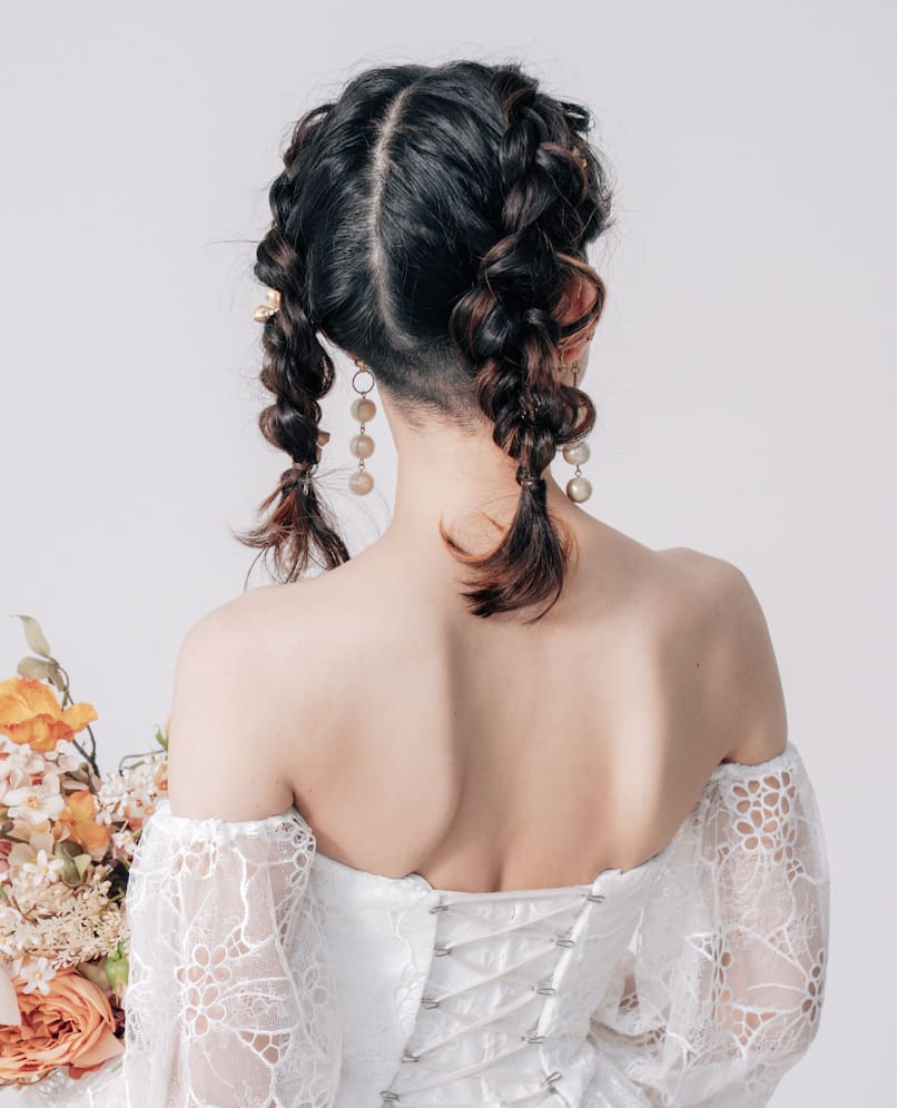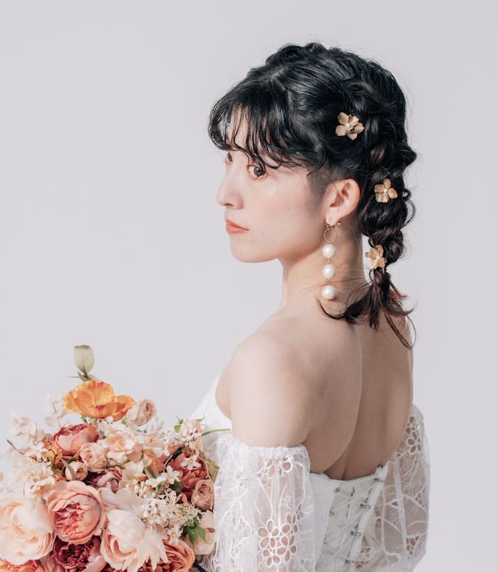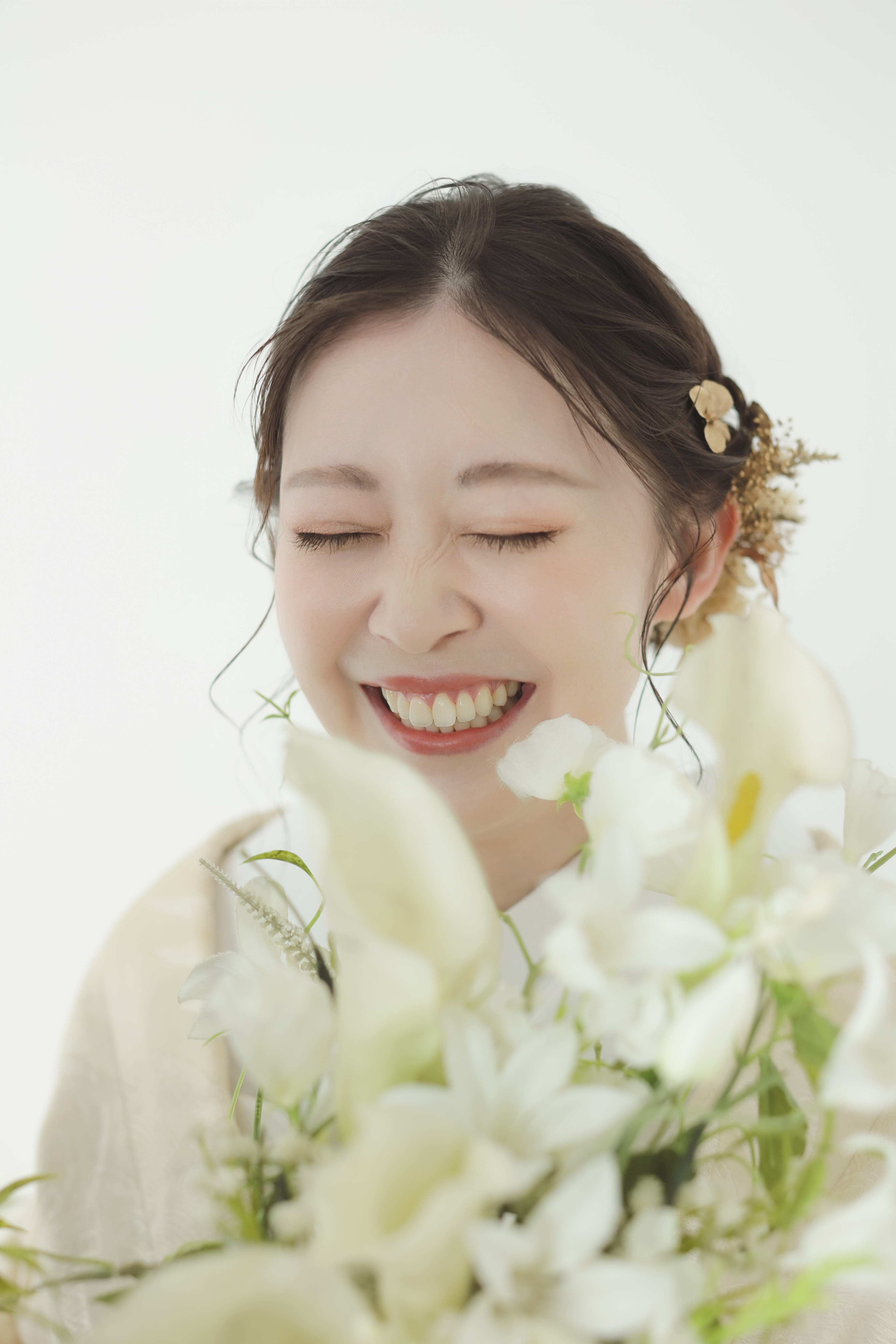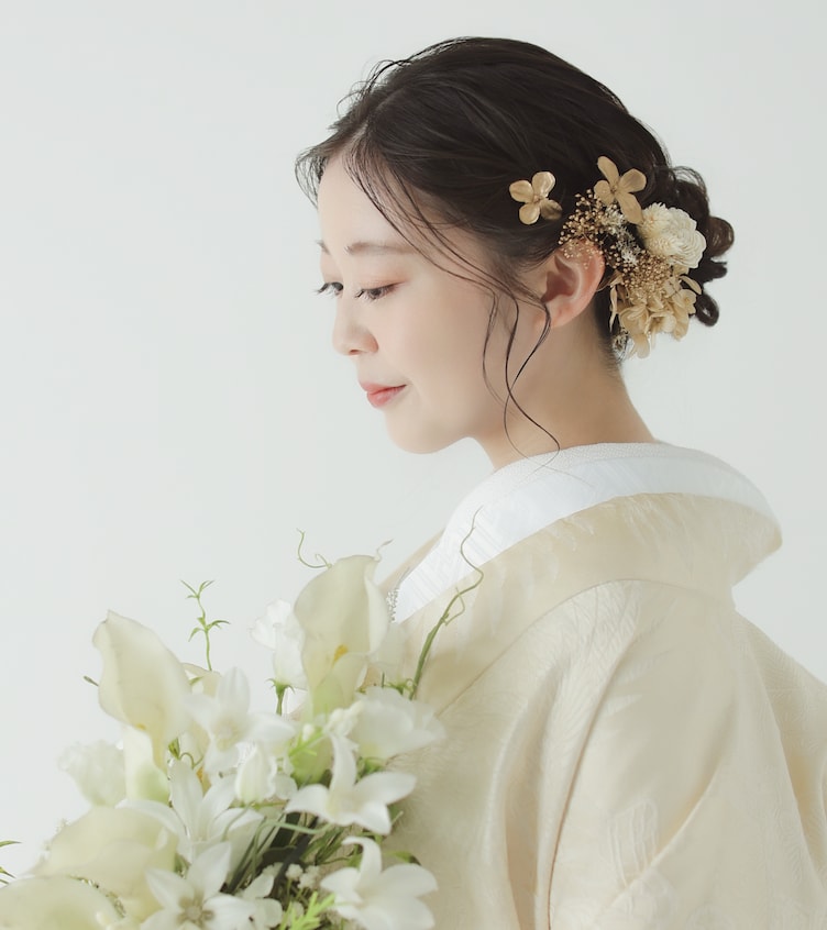こんにちは、ヘアメイクの藤若です。 今回は春にぴったりのヘアメイクのご紹介です。 [TM_121.jpg] 春らしい柔らかい色合いを取り入れ、新婦様の可愛らしさを引き立てるヘアメイクです。 ヘアはシンプルにローポニースタイルで、小ぶりの蘭の花で華やかさを演出しました。 前髪はくるっと可愛く仕上げました! [TM_080.jpg] 今回の撮影では、3月に入荷したての新作の色打掛吉祥富貴文ピンクをお召しいただきました! 淡い薄桃色の生地にふきの色はクリーム色の愛らしい仕上がりとなっております。 慶事の花々が散りばめられた縁起の良い絵柄で、鶴は入っていないです。 鮮やかな色彩と洗練されたデザインが、スタジオの落ち着いた雰囲気に溶け込み、新婦様の大人っぽさと可愛らしさを一層引き立てました。 [TM_067.jpeg] また、2着目に白無垢と洋髪綿帽子のスタイルも撮影致しました! 特に洋髪綿帽子を使用したスタイルは、伝統と今を見事に融合させ、ナチュラルに仕上げました。 綿帽子からチラッと覗くミモザが可愛いです。 [TM_159.jpg] [TM_140.jpg] 現在はおカツラを被らなくても、洋髪綿帽子をお召しいただけます! 白無垢でしか着用できない貴重な体験です。是非お試しくださいませ☆ photo:宮崎 哲 make:大森 彩季 hair: 藤若かおり