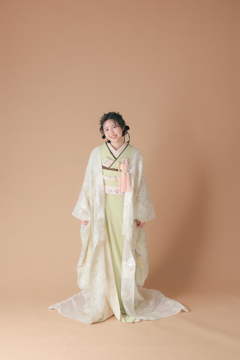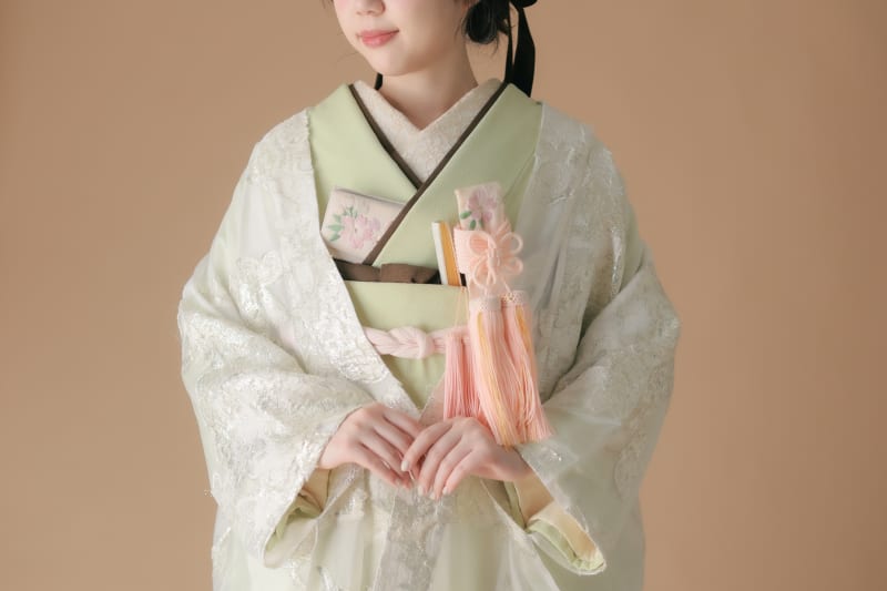 中に着ている緑色の着物は打掛の下に着る「掛下」という着物です。