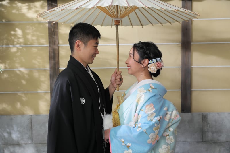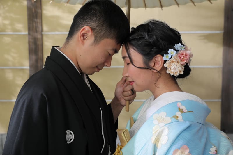 新宿店の本格的な茶室スタジオで撮影する、和装の結婚写真