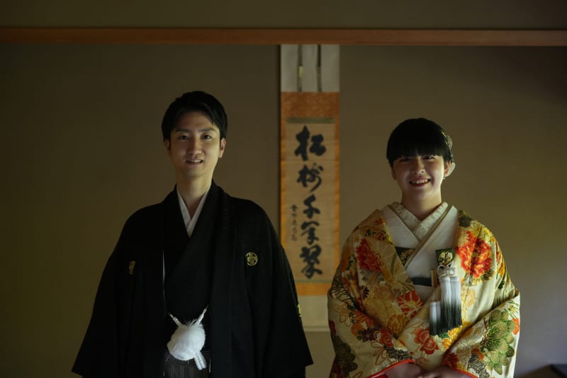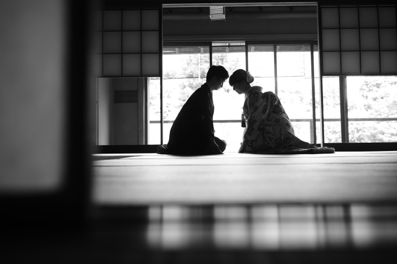 新宿店の本格的な茶室スタジオで撮影する、和装の結婚写真