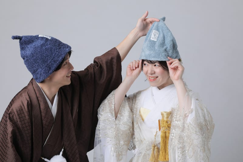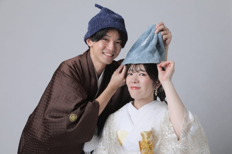 サウナハットを被せてあげる新郎さまと嬉しそうに微笑む新婦さま