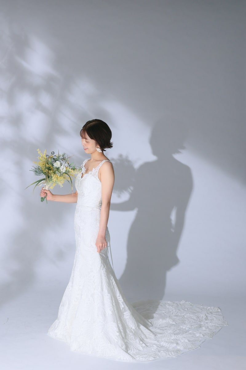 繊細なレース刺繍と長めのトレーンがポイントです。