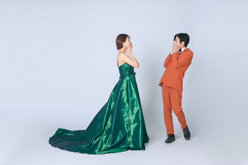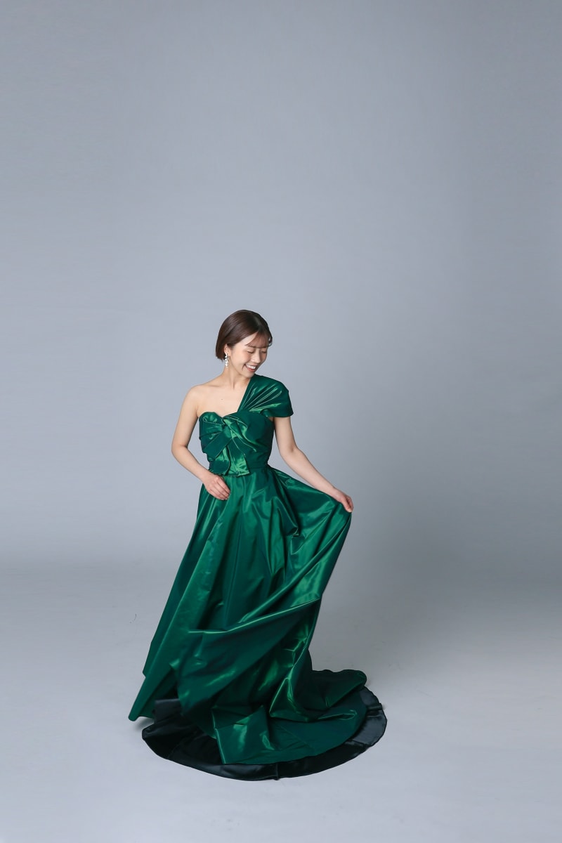 胸元の特徴的かつ斬新さが目を引くグリーンのカラードレス