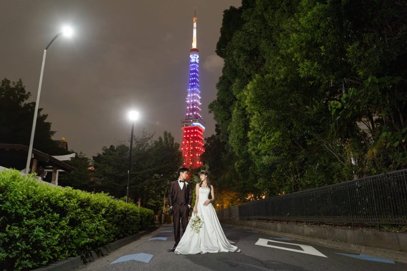 ライトアップされた東京タワーの鮮やかなオリンピックカラーは、お二人の特別な日にさらなる彩りを加えてくれました。この限定カラーは、普通の時とは違い、まるでその瞬間を象徴するかのように輝いていました。そのため、撮影した写真にはより一層特別感が漂い、思い出深いものになったことは間違いありません。