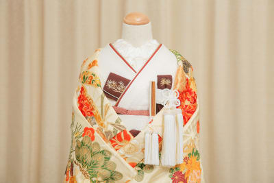 ・打掛→1番外側に着るお着物。 お衣装合わせにてお選びいただけます。