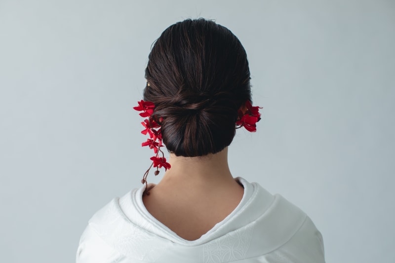 髪飾りはこちらも差し色として、赤のお花と金箔を使用。