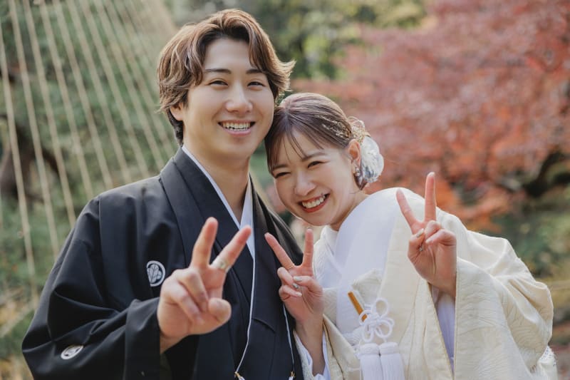 新婦は伝統的な白無垢をお召しになり、ハイトーンカラーのヘアスタイルが新鮮なアクセントを加えていました。カラーはご新郎様が担当されました!