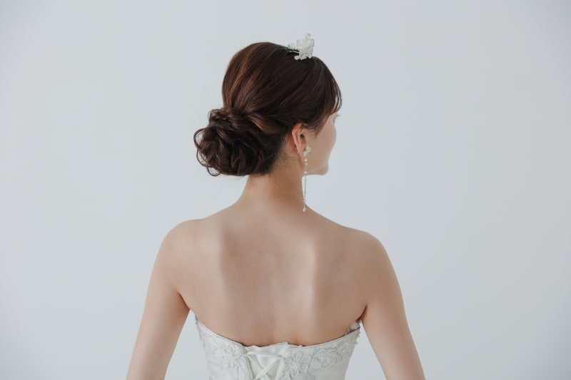 ヘアスタイルは、トップに動きを出したシニヨンスタイル