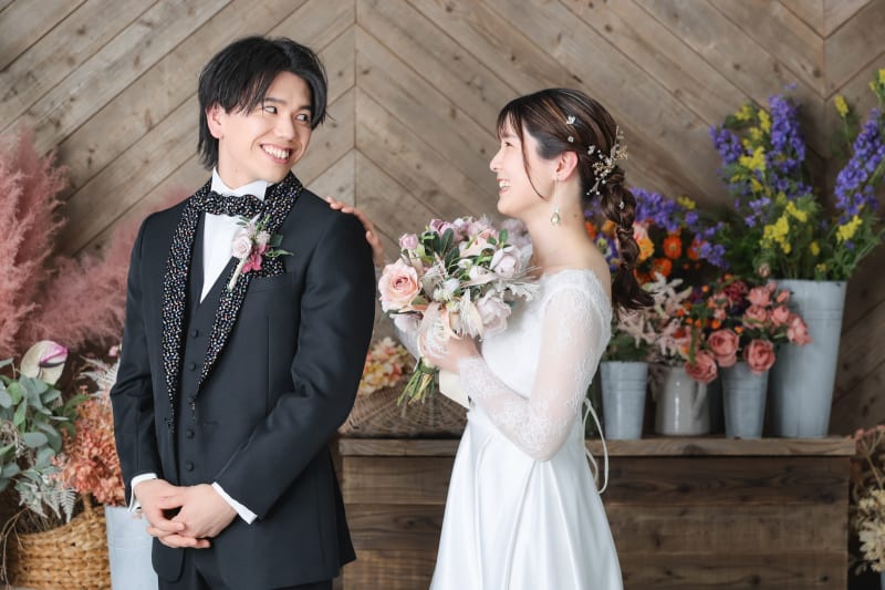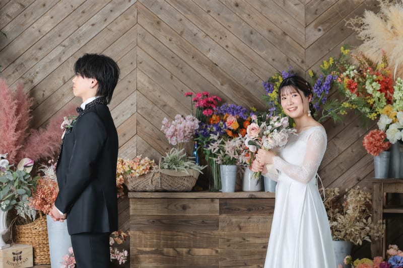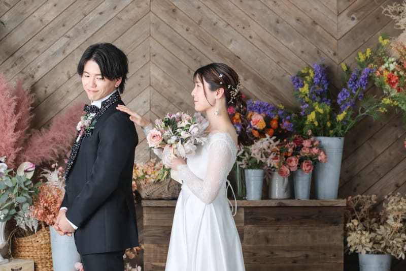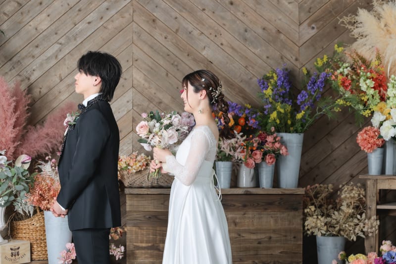 一面お花の壁が登場!新宿店ハウススタジオで撮影する洋装ウェディングフォトプラン