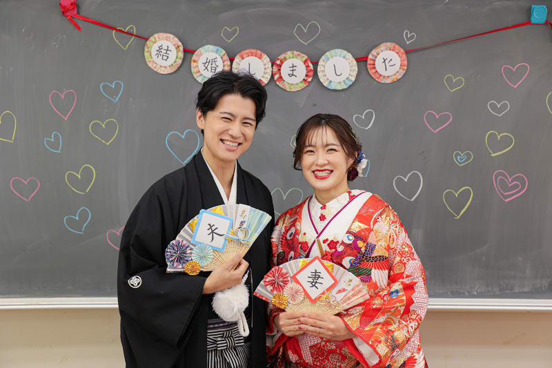 ↓こちらは母校での撮影でした!黒板を借りて、チョークでお絵描きして華やかに♡