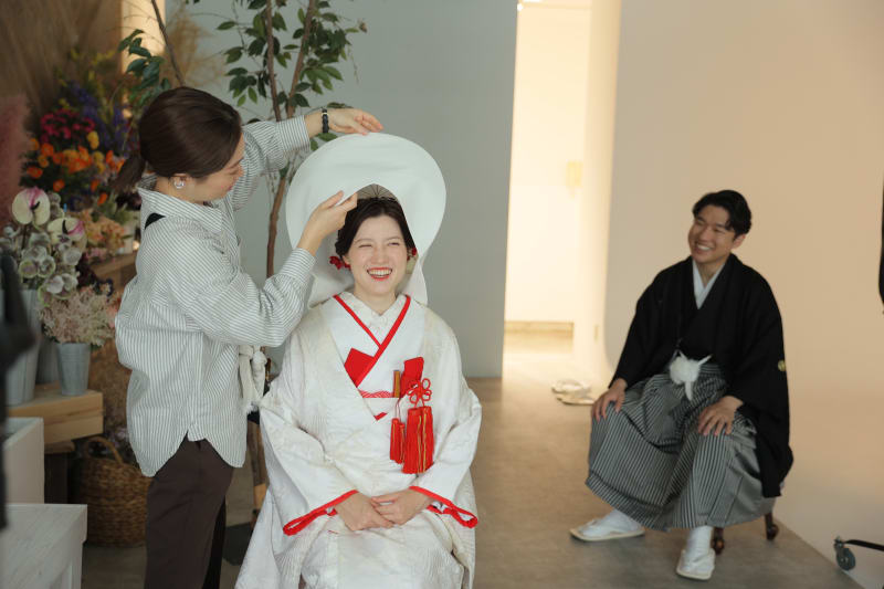 撮影中の取り外しも可能なので、綿帽子をつけた姿、つけてない姿どちらものお写真を残すことができます。