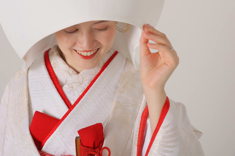 綿帽子は白無垢の挙式時に付ける帽子で、ウェディングベールと同じ役割を果たします。