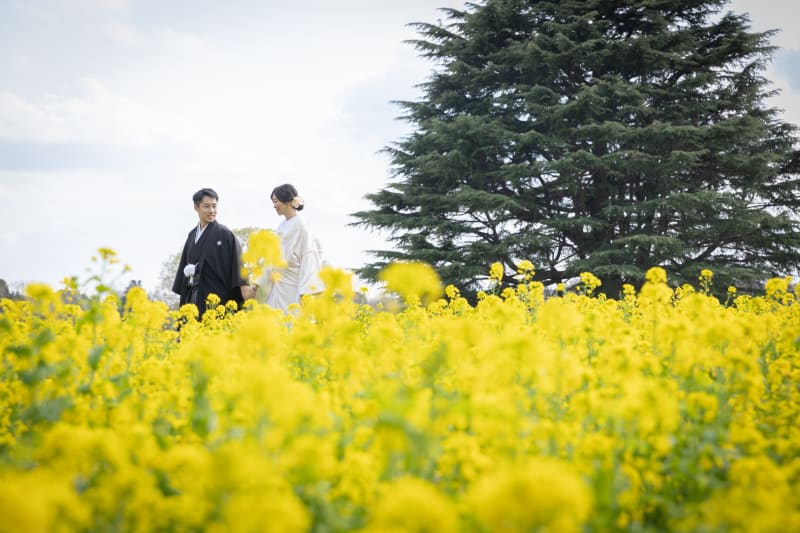 菜の花の明るい黄色と白無垢の上品さが絶妙に調和し、まるで春の祝福を受けているかのような雰囲気がありました。