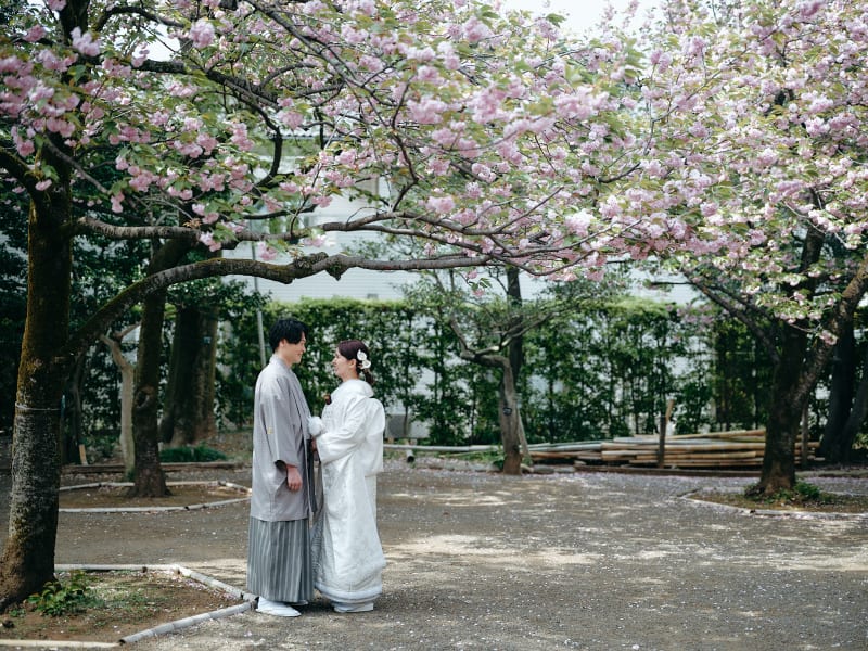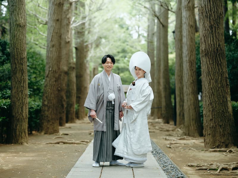白無垢に綿帽子という伝統的な装いが、緑豊かな公園の中で一層輝きを増していました。