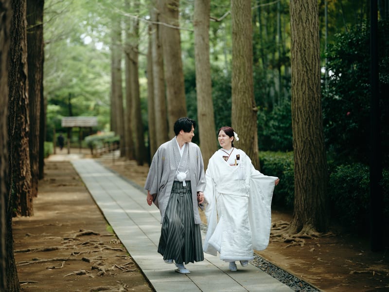 白無垢に綿帽子という伝統的な装いが、緑豊かな公園の中で一層輝きを増していました。