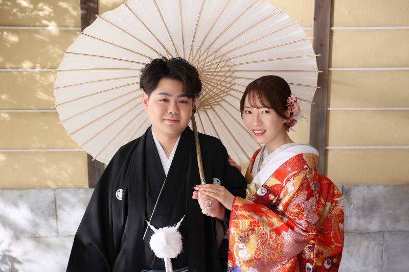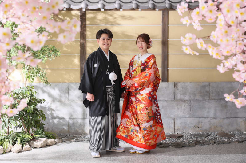 桜の淡いピンクが和装の美しさをさらに引き立て、お二人の輝く姿が際立ちました。