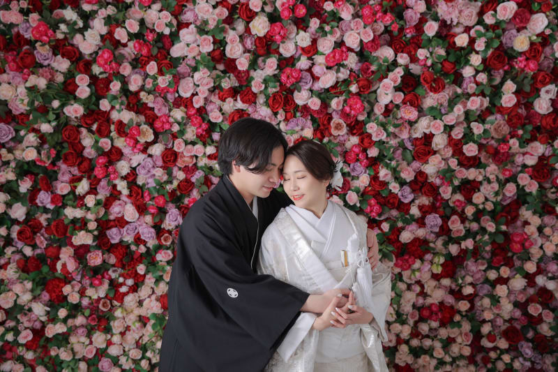 特に印象に残ったのはスタジオのバラ壁の前でのショットです。華やかなバラの装飾が、和装の持つ優美さと完璧に調和し、まるで映画のワンシーンのような仕上がりに。