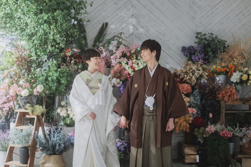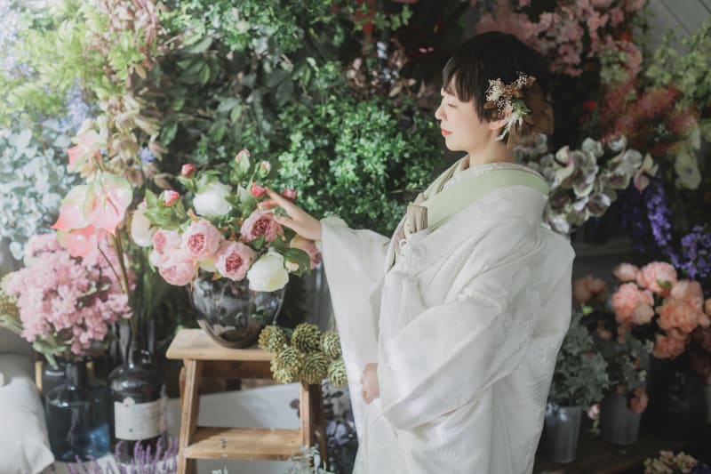 今回お二人が選ばれたのは、リニューアルしたばかりのボタニカルな雰囲気が漂うハウススタジオ。和装スタイルに身を包んだ新郎新婦は、お花が本当にお似合いで、その華やかさと相まって見事なステージが完成しました。