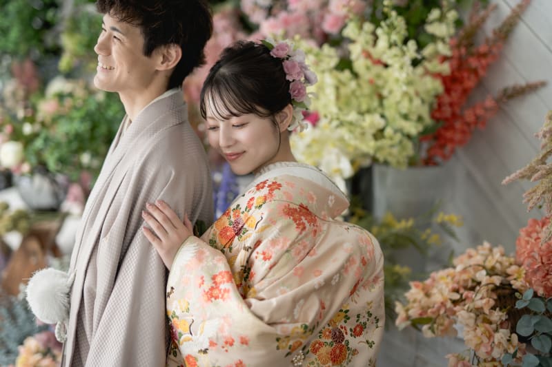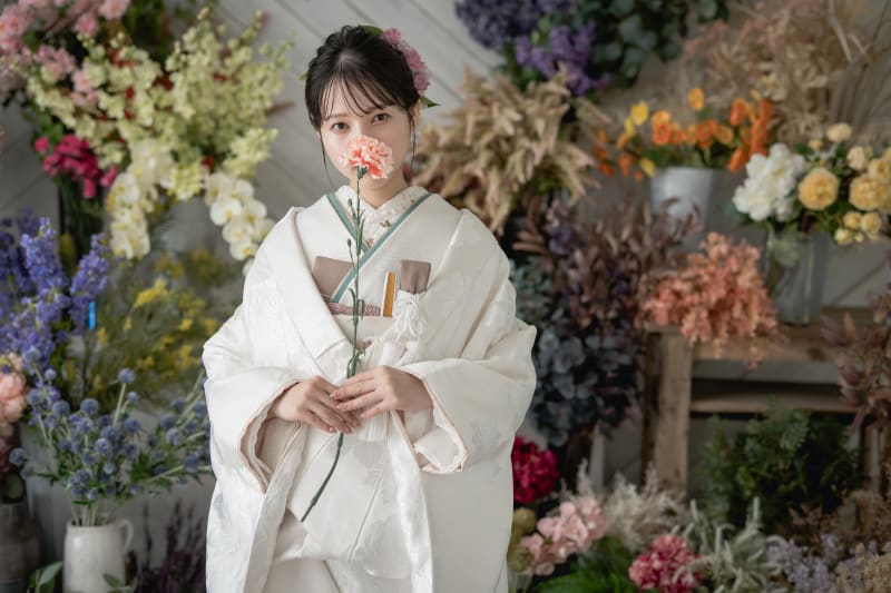 白無垢での撮影も背景の鮮やかさが、着物をより一層引き立てます。