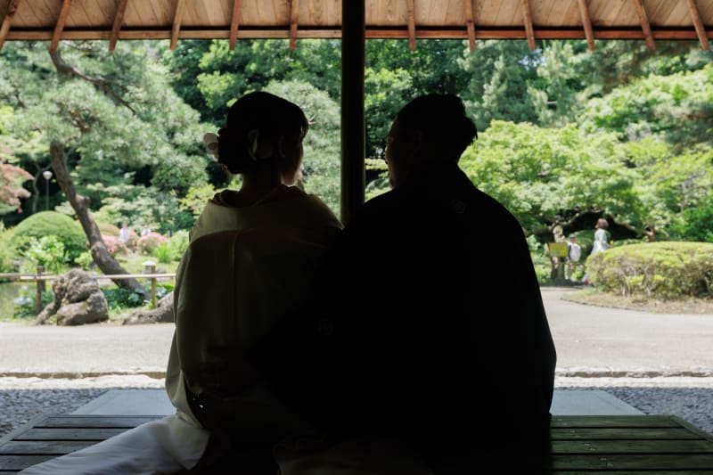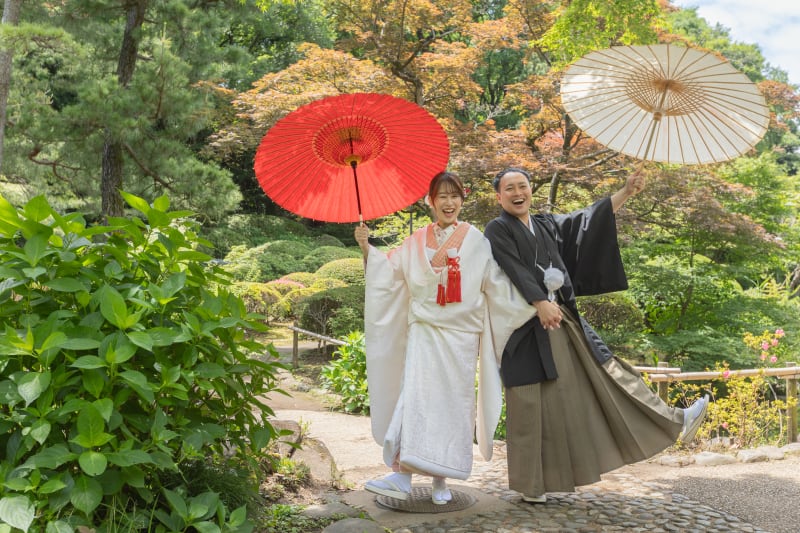 まずは、和装らしく和傘を持って。自然の緑の中のお二人の和装姿がとっても映えていますね!