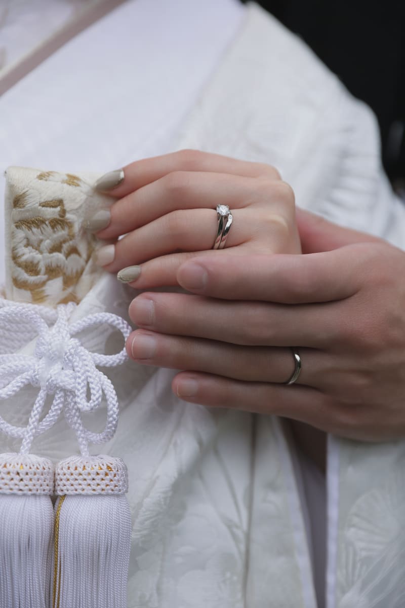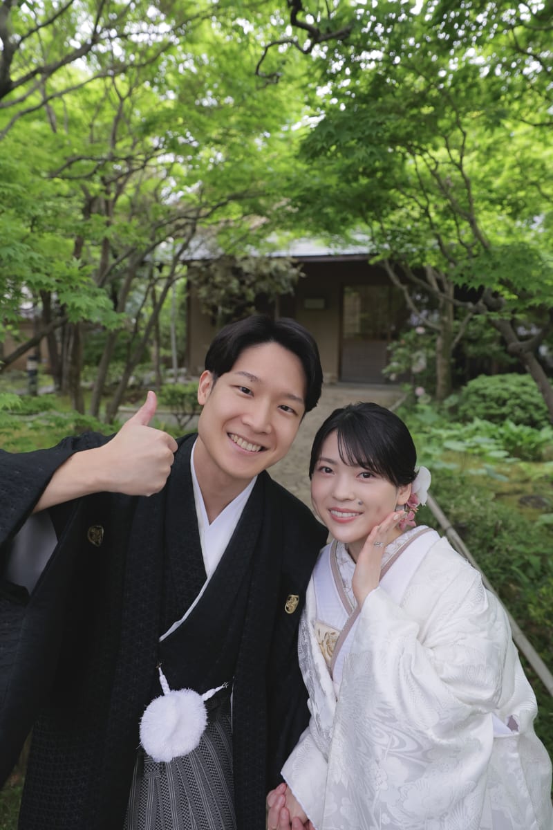 おふたりは笑顔が絶えず、可愛らしい雰囲気が印象的でした。初夏の目白庭園は新緑がとても美しく、和装姿のおふたりにぴったりのロケーションでした。特に、新婦様の白無垢姿は目を見張る美しさで、お庭の緑に映えていました。