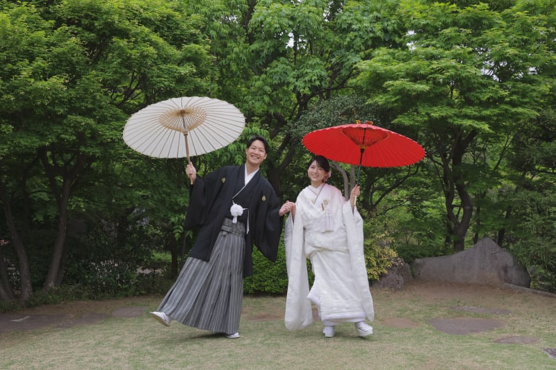 また、おふたりの好きなポーズをお伺いしたところ、和傘を掲げながら手をつなぐという、可愛らしいポーズが誕生しました。目白庭園の風景と相まって、こちらもとても素敵な写真に仕上がりました。