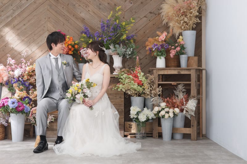 続いて、移動したハウススタジオでは、洋装にチェンジ。洋装ではおふたりともさらにおしゃれで、動きのある撮影が楽しみとなりました。特に印象的だったのは、新郎が新婦をおんぶして撮影したカット。おふたりの仲の良さが伝わる瞬間でした。