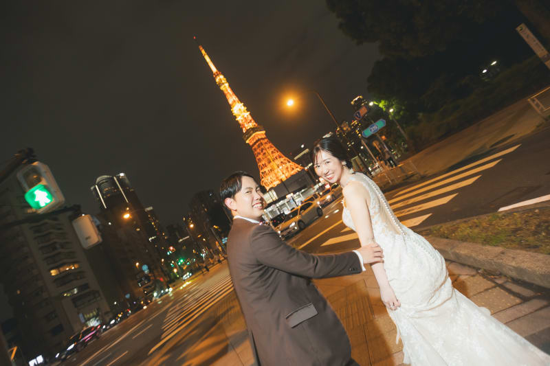 その後、ロケーションを東京タワーに移し、さらなる撮影を行いました。東京タワーを背景にしたお二人の笑顔は圧巻で、都会の魅力を最大限に活かした素敵なカットが撮影できました。